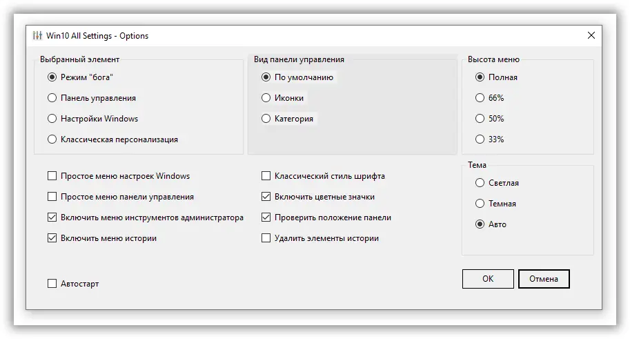 - Автоматическое создание папки «Режим бога» с полным набором системных инструментов.
