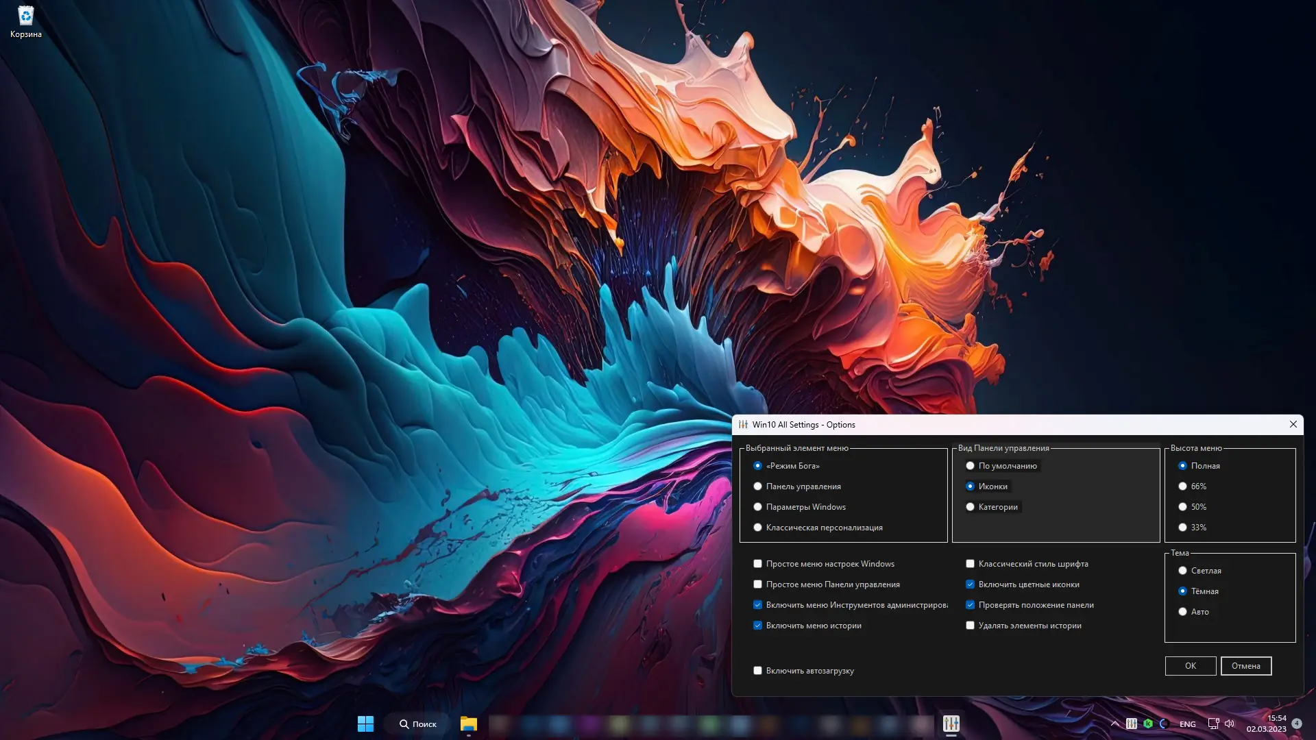 - Автоматически создаёт папку «Режим бога» для полного контроля над системой