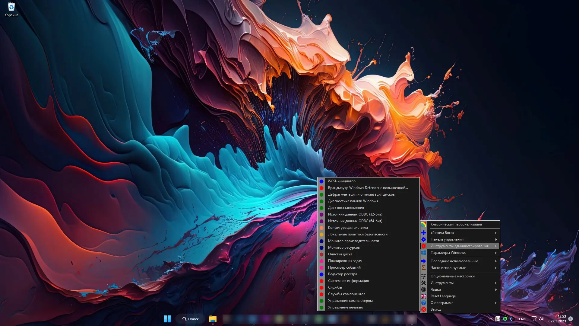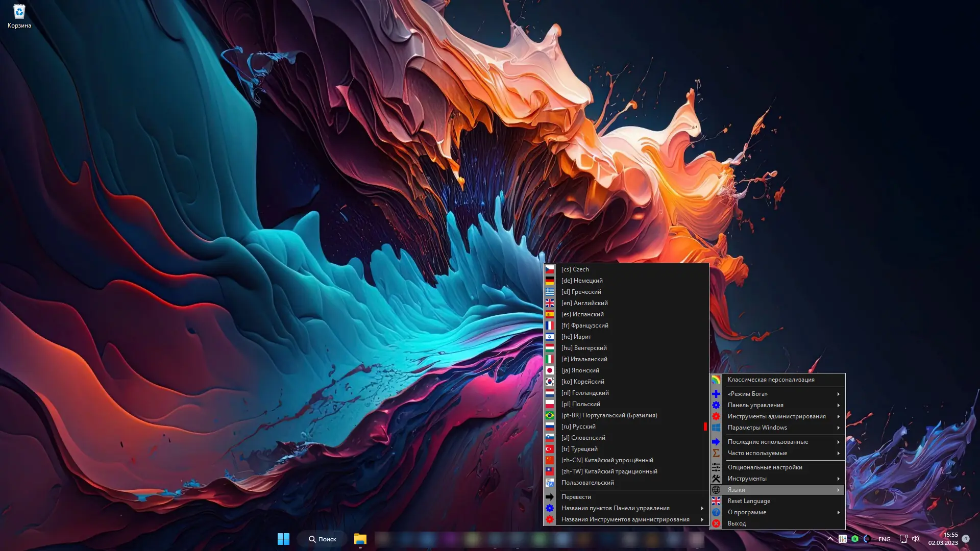 Использование приложения не требует специальных навыков. После запуска исполняемого файла значок программы отображается в системном трее. Левый клик по нему открывает папку с расширенными настройками, а правый вызывает контекстное меню с разделами: персонализация, параметры Windows, элементы панели управления, инструменты администрирования и дополнительные утилиты. В настройках можно включить автозапуск, изменить язык интерфейса и настроить поведение меню. Пользователи могут также создать ярлык «Режима бога» на рабочем столе, который будет работать независимо от запуска основной программы. Поддержка нескольких языков, включая русский, делает интерфейс доступным для широкой аудитории.
