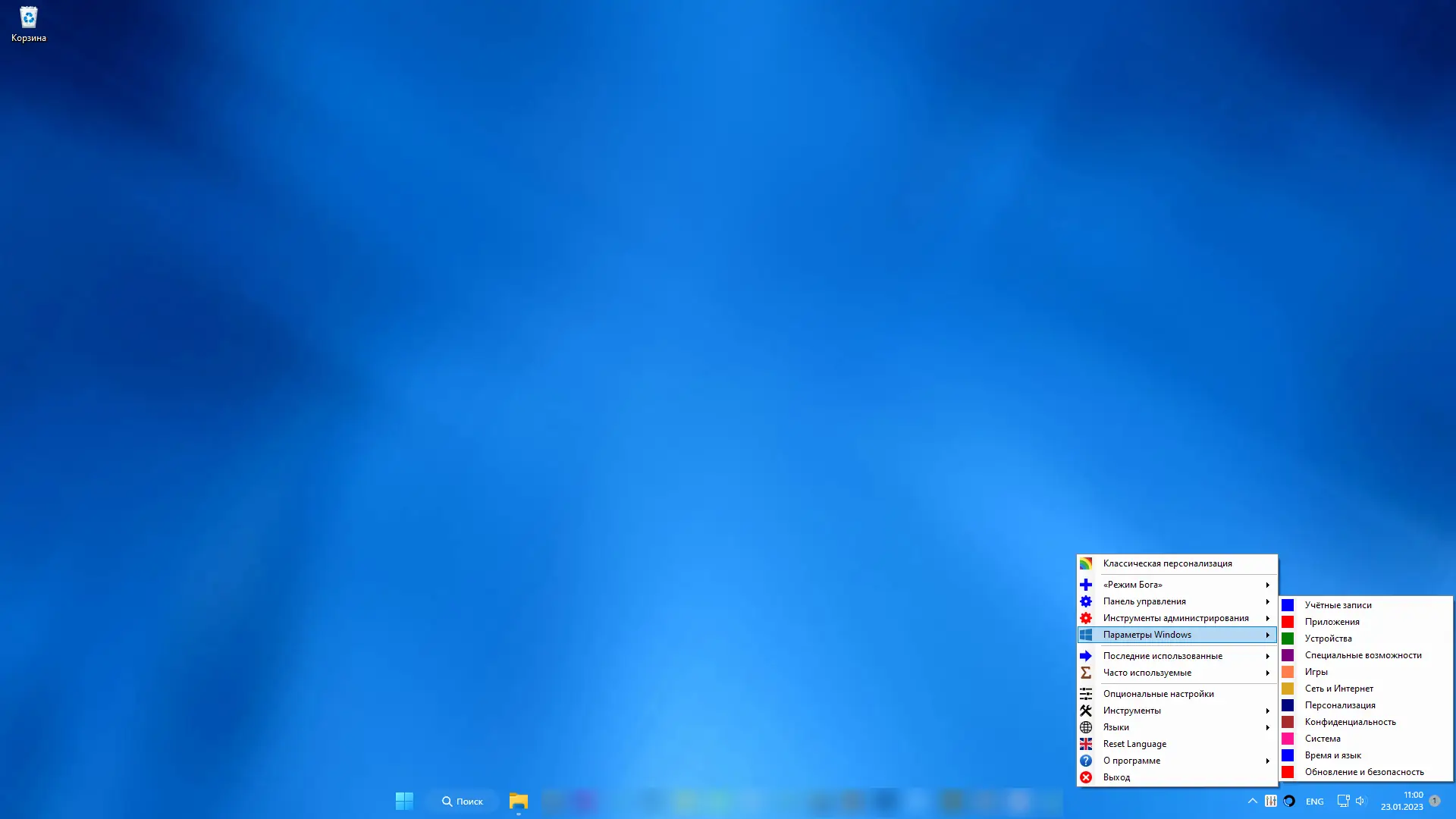 - Контекстное меню программы включает прямые ссылки на параметры Windows, элементы управления и средства администрирования.