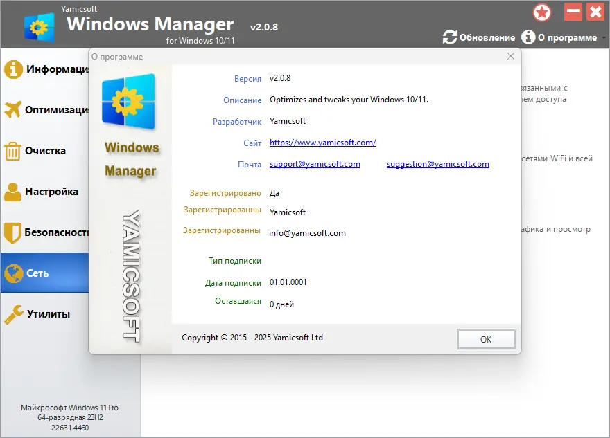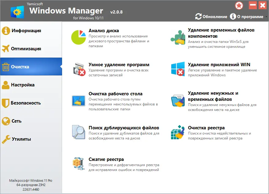 Windows Manager — это универсальный инструмент для комплексной оптимизации, настройки и очистки операционных систем Windows 10 и 11. Программа объединяет более сорока встроенных утилит, позволяя ускорить работу системы, устранить ошибки, повысить стабильность, безопасность и персонализировать интерфейс под индивидуальные предпочтения пользователя. Благодаря широкому функционалу, утилита подходит как для новичков, так и для опытных пользователей.
