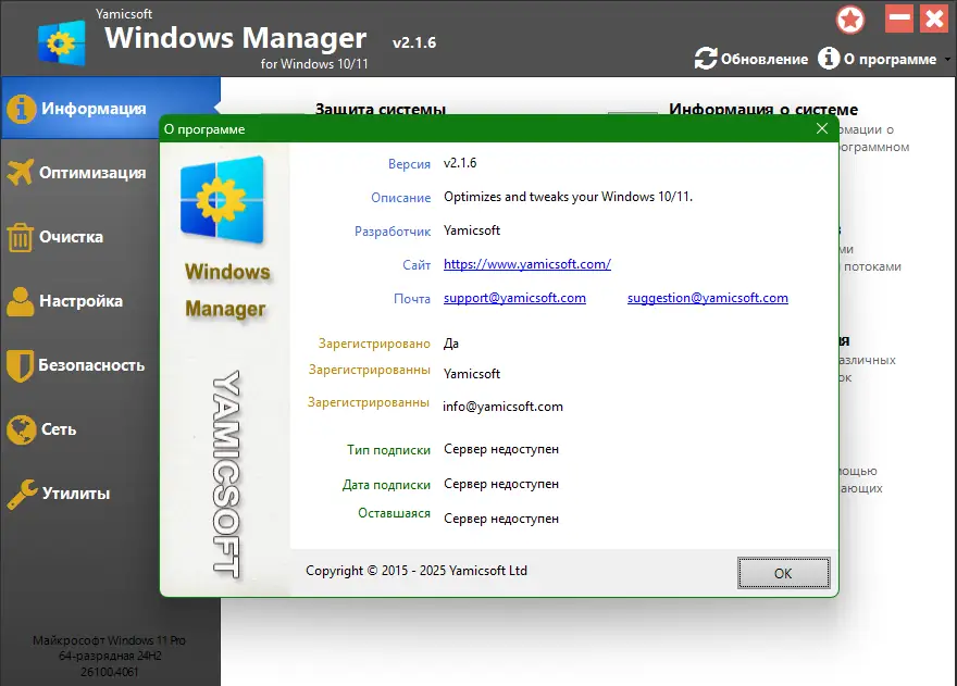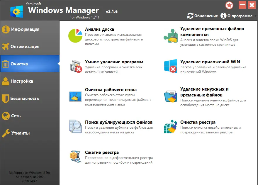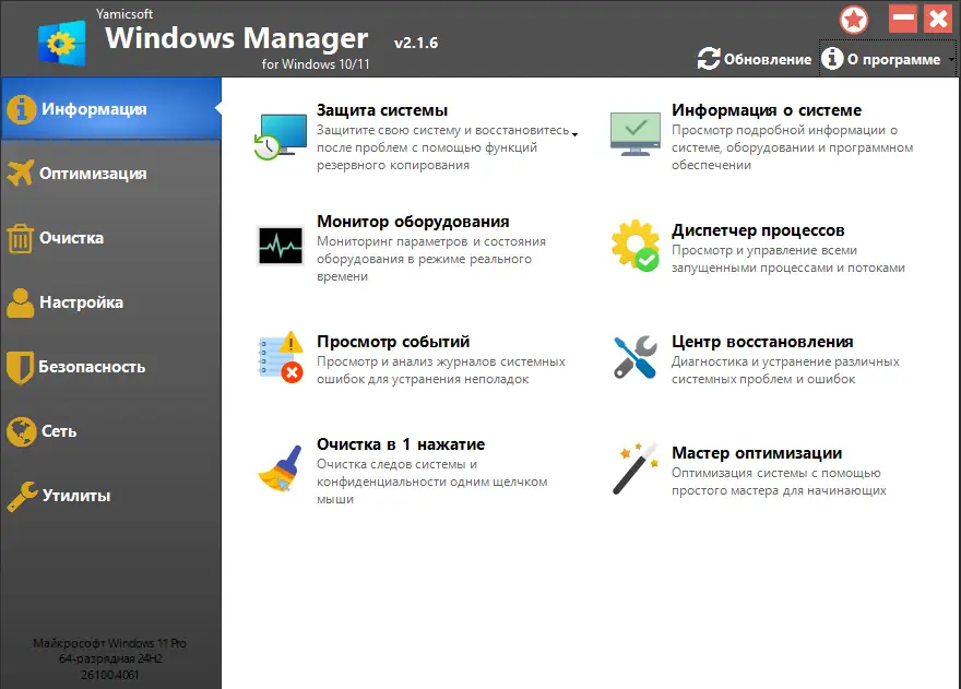 Windows Manager — мощная утилита для комплексной оптимизации, настройки и обслуживания операционных систем Windows 10 и 11. Программа объединяет более сорока инструментов, предназначенных для повышения производительности, устранения неполадок, очистки системы и персонализации интерфейса. С её помощью можно эффективно управлять системными параметрами, улучшить безопасность и стабильность, а также освободить дисковое пространство.