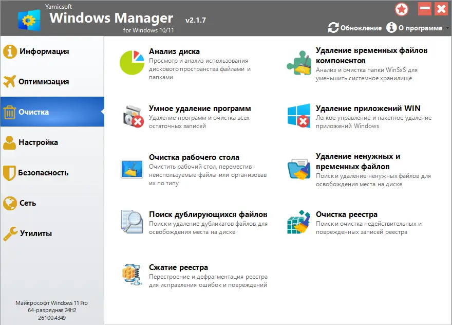 Windows Manager — это универсальный инструмент для глубокой оптимизации, настройки и ускорения работы операционных систем Windows 10 и 11. Программа объединяет более сорока встроенных утилит, охватывающих очистку системы, управление автозагрузкой, персонализацию интерфейса, повышение безопасности и диагностику сетевых подключений. Благодаря интуитивному интерфейсу и комплексному подходу, решение подходит как для новичков, так и для продвинутых пользователей, стремящихся выжать максимум производительности из своей системы.