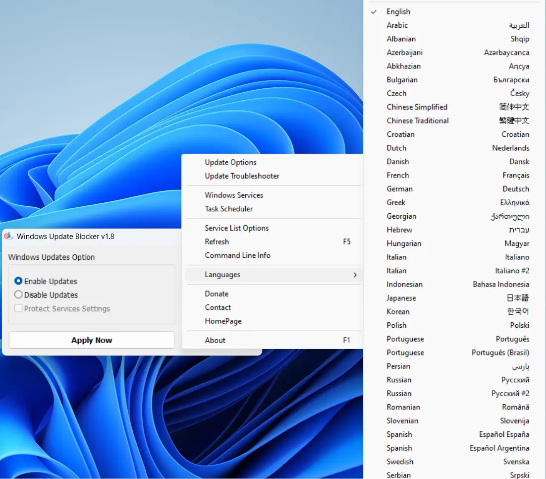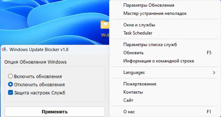 Использование программы предельно простое: после запуска пользователь видит два основных состояния — «включено» и «отключено». Выбрав нужный режим, достаточно нажать соответствующую кнопку, и служба Windows Update будет остановлена или запущена. Для восстановления работоспособности службы в случае сбоя можно использовать параметр /R, реализованный в версии windows 1.8. Дополнительно утилита позволяет указать в конфигурационном файле процессы, которые будут закрыты перед выполнением операций с обновлениями. Язык интерфейса легко изменяется через пункт меню — достаточно выбрать «Languages» и установить русский. Это удобно при использовании на чужих устройствах, где основной язык — win или английский.