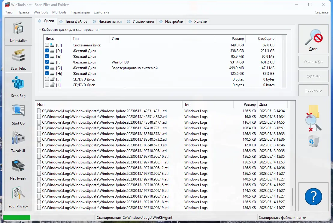 - Инструмент Scan Files сканирует диск на наличие временных и ненужных файлов