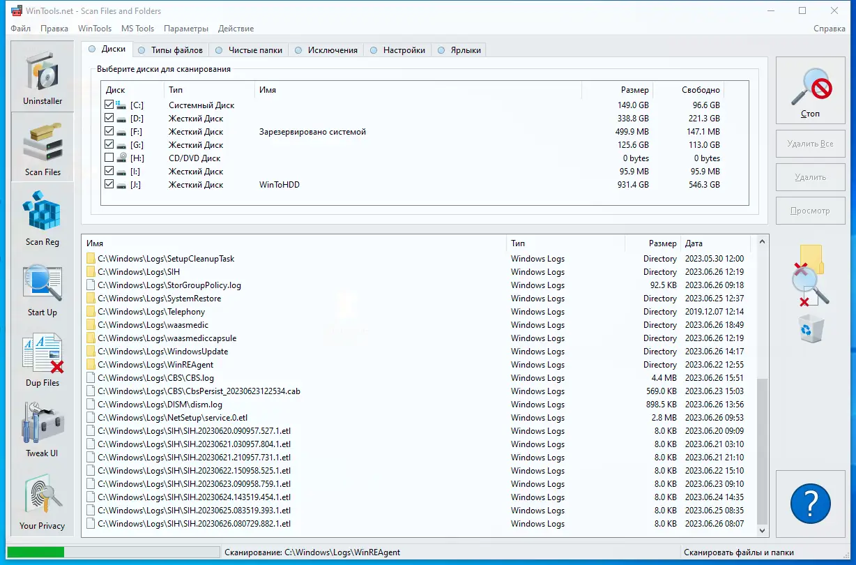 - Функция Scan Files помогает находить и удалять временные файлы, оставшиеся после сбоев или некорректного завершения работы приложений.