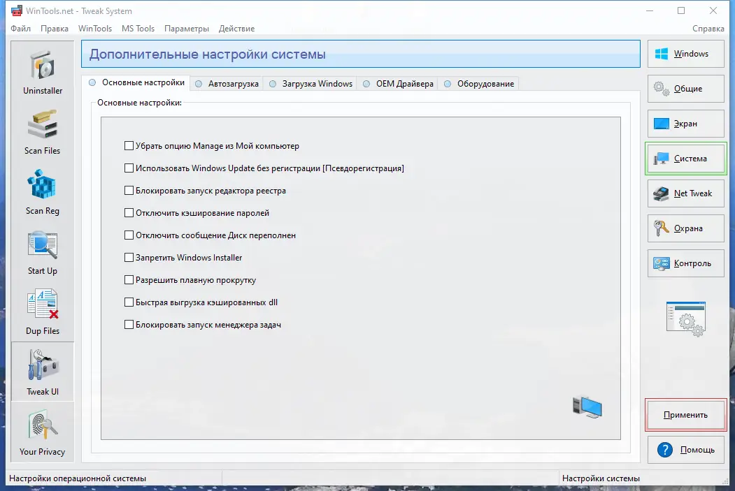 Использование WinTools.net не требует специальных знаний. После запуска программы пользователь видит список доступных инструментов, каждый из которых соответствует определённой задаче. Для очистки системы достаточно запустить Scan Files или Scan Registry, выполнить сканирование и подтвердить удаление найденных элементов. Clean Uninstaller следует использовать при деинсталляции программ, чтобы гарантировать полное удаление всех связанных файлов и ключей реестра. StartUp Manager позволяет просматривать и редактировать список автозагрузки, отключая нежелательные приложения. Модуль Tweak UI открывает доступ к скрытым параметрам системы, которые можно изменять по своему усмотрению.