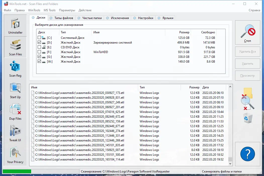 - Инструмент Scan Files сканирует диск на наличие временных, кэшированных и неиспользуемых файлов, которые со временем замедляют работу системы.