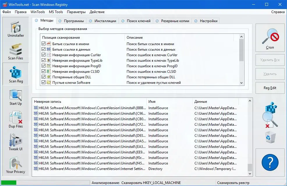 - Функция Scan Registry анализирует целостность реестра, выявляя устаревшие, неверные или дублирующиеся ключи.