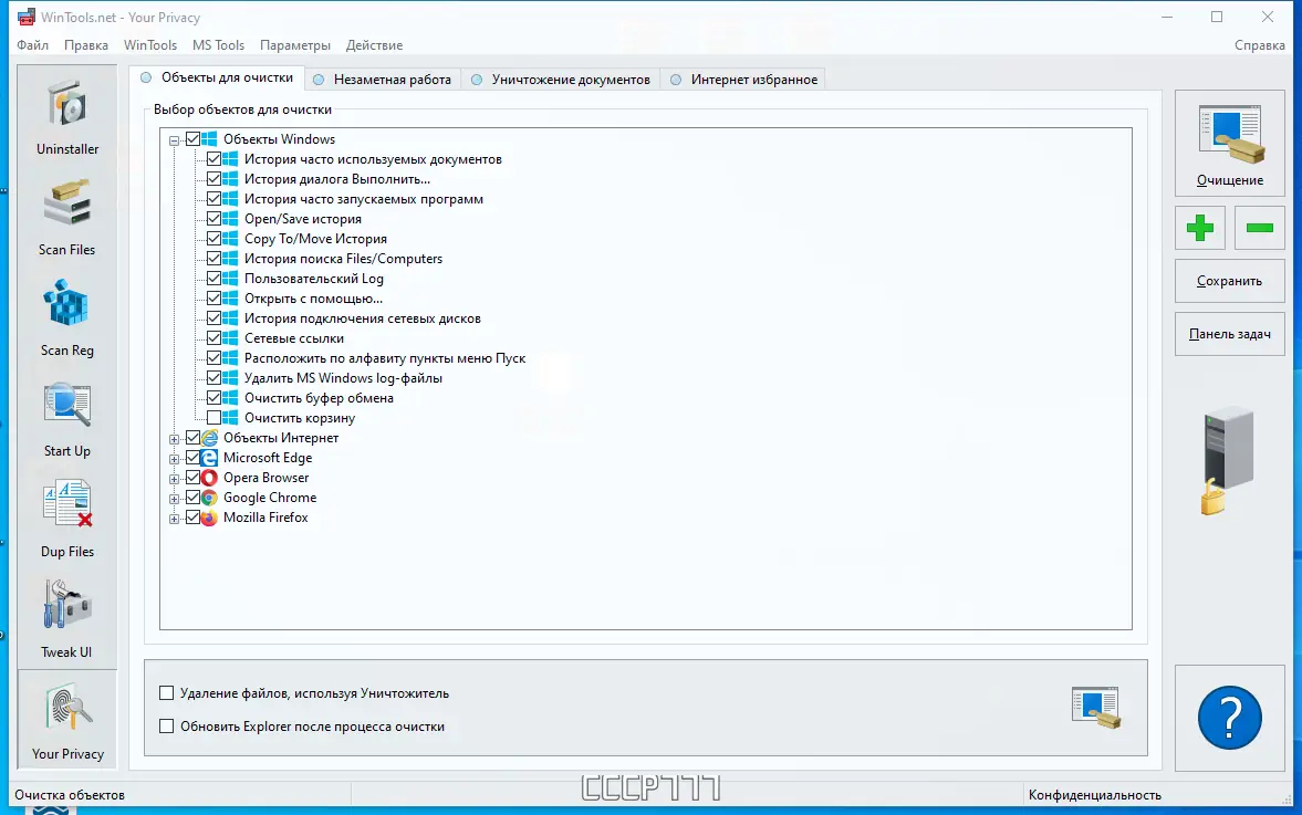 Интерфейс программы интуитивно понятен и разделён на логические блоки, соответствующие каждому инструменту. Пользователь может запускать сканирование по отдельности или использовать комплексную очистку. Перед удалением файлов или записей в реестре система создаёт точку восстановления, что исключает риск потери данных. Все действия сопровождаются подробными отчётами, в которых отображаются найденные элементы и внесённые изменения.