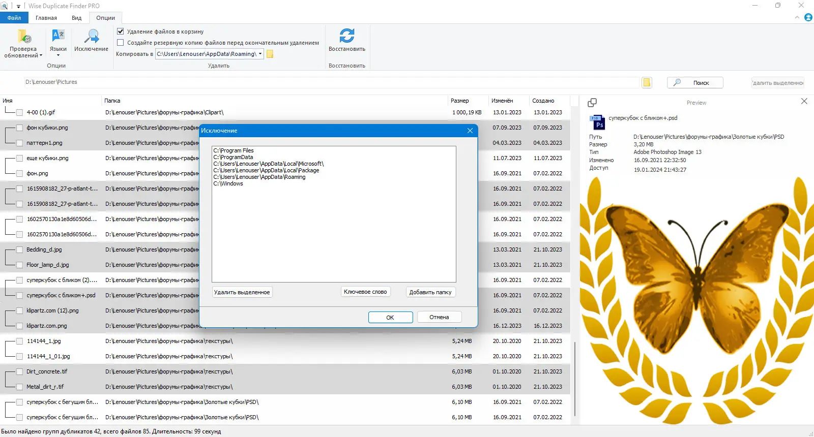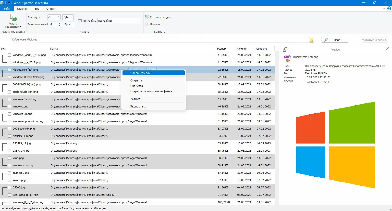 Wise Duplicate Finder — это эффективное решение для поиска и удаления дублирующихся файлов на компьютере. Программа анализирует данные по имени, размеру и содержимому, помогая освободить место на диске и навести порядок в файловой системе. Поддержка резервного копирования и гибкие настройки поиска делают её удобным инструментом для повседневного использования.