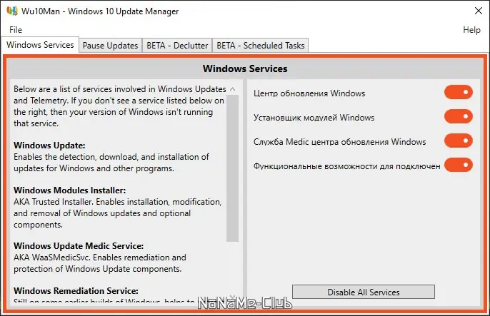 - Программа отключает все ключевые службы, связанные с обновлением системы, включая те, что отвечают за фоновую проверку состояния Центра обновления.
