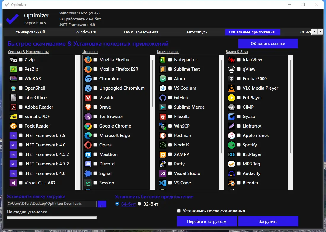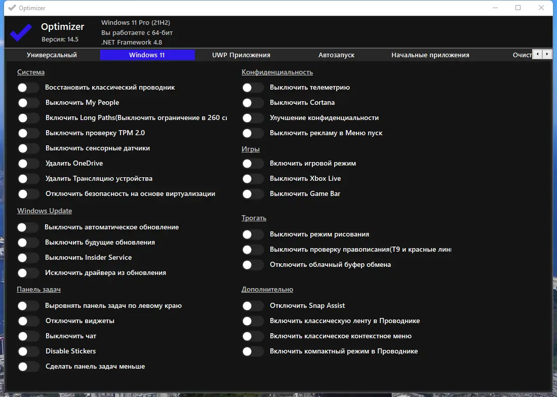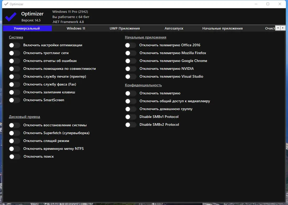 Optimizer — это мощная утилита для тонкой настройки операционной системы, позволяющая усилить защиту, улучшить производительность и восстановить контроль над конфиденциальностью. Программа особенно полезна после чистой установки Windows, помогая отключить встроенные службы сбора данных и оптимизировать систему под индивидуальные нужды пользователя. Её функционал охватывает широкий спектр задач — от отключения телеметрии до управления сетевыми настройками и очистки дисков.