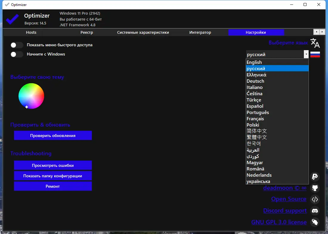 Optimizer представляет собой инструмент для продвинутой настройки системы, ориентированный на пользователей, стремящихся к максимальной приватности и эффективной работе Windows. Приложение даёт полный контроль над компонентами операционной среды, позволяя устранить фоновые процессы, которые могут замедлять работу ПК или передавать данные в облако. Поддержка множества языков, включая русский, делает его доступным для широкой аудитории.