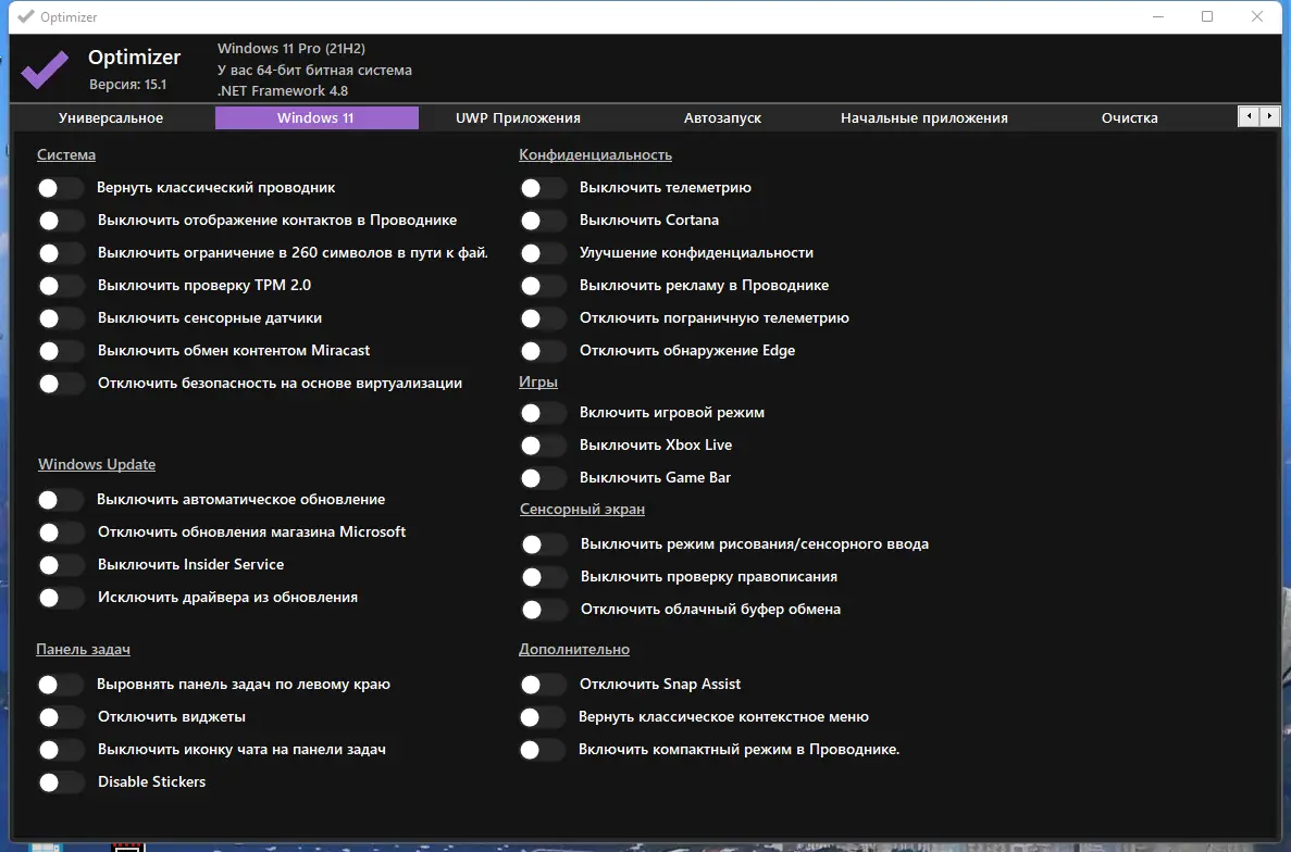 Optimizer — это мощная утилита для тонкой настройки операционной системы, обеспечивающая расширенный контроль над параметрами безопасности, приватности и производительности. Программа предназначена для пользователей, желающих глубоко оптимизировать систему после чистой установки Windows, устраняя ненужные процессы, службы и элементы телеметрии.