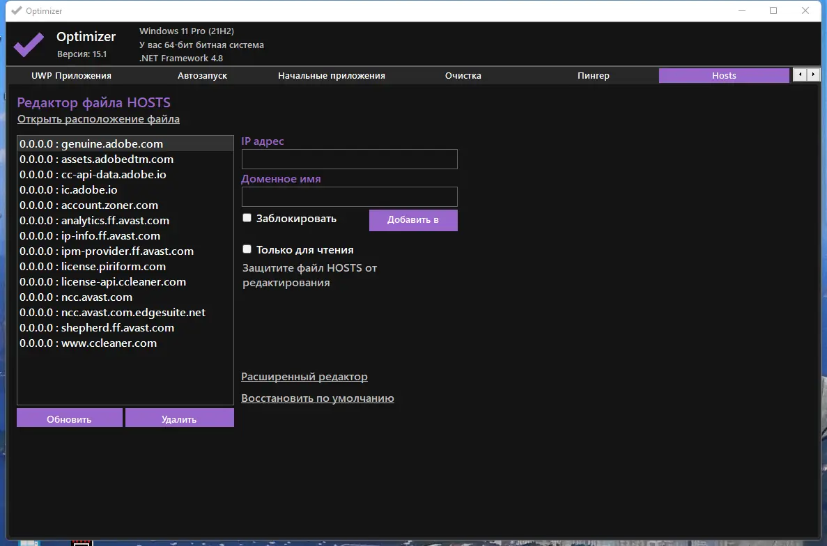 - Позволяет редактировать системный файл HOSTS и управлять автозагрузкой, удаляя нежелательные программы, запускаемые при старте системы.
