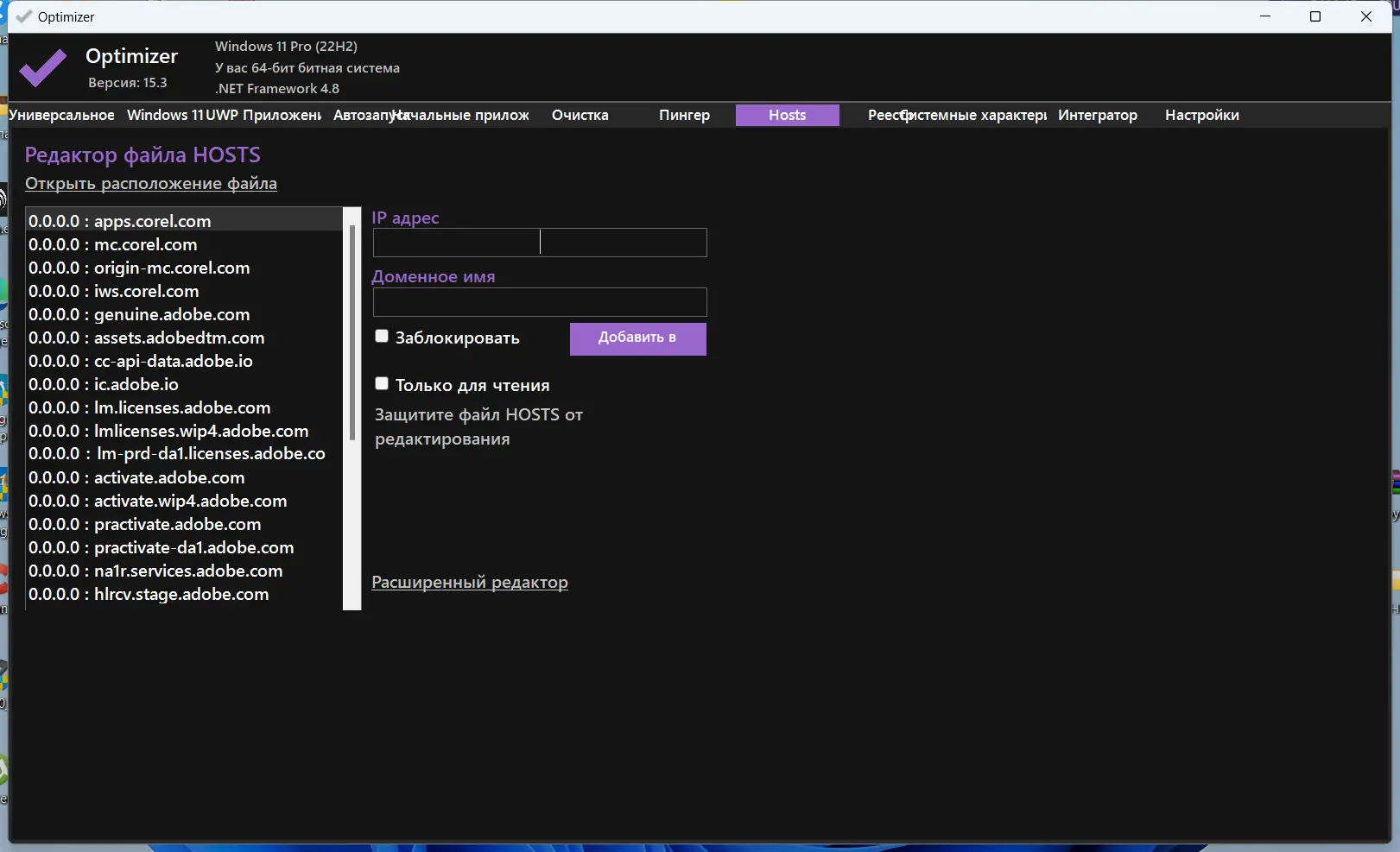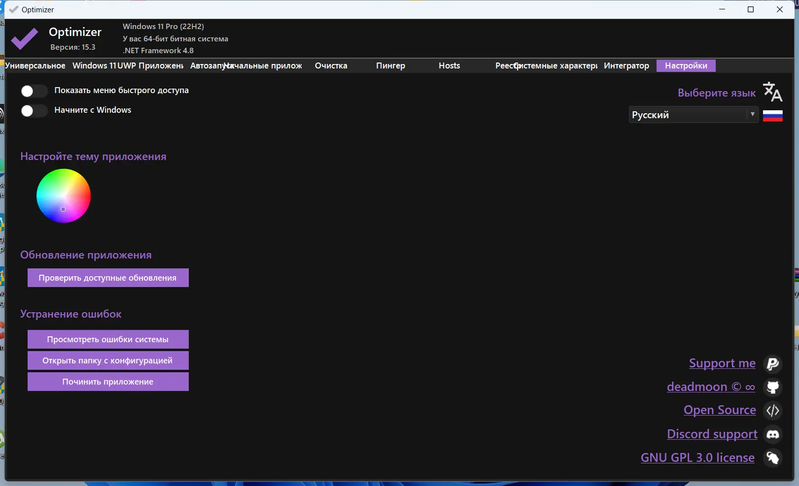 Optimizer представляет собой инструмент расширенной настройки, предназначенный для пользователей, стремящихся получить полный контроль над своей системой. Он сочетает в себе функции оптимизации, безопасности и администрирования, позволяя настраивать систему под индивидуальные потребности. Программа поддерживает широкий спектр операций — от отключения телеметрии до редактирования реестра и управления автозагрузкой.