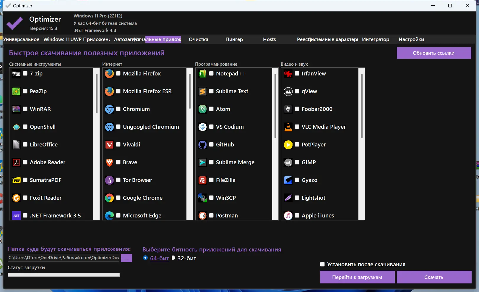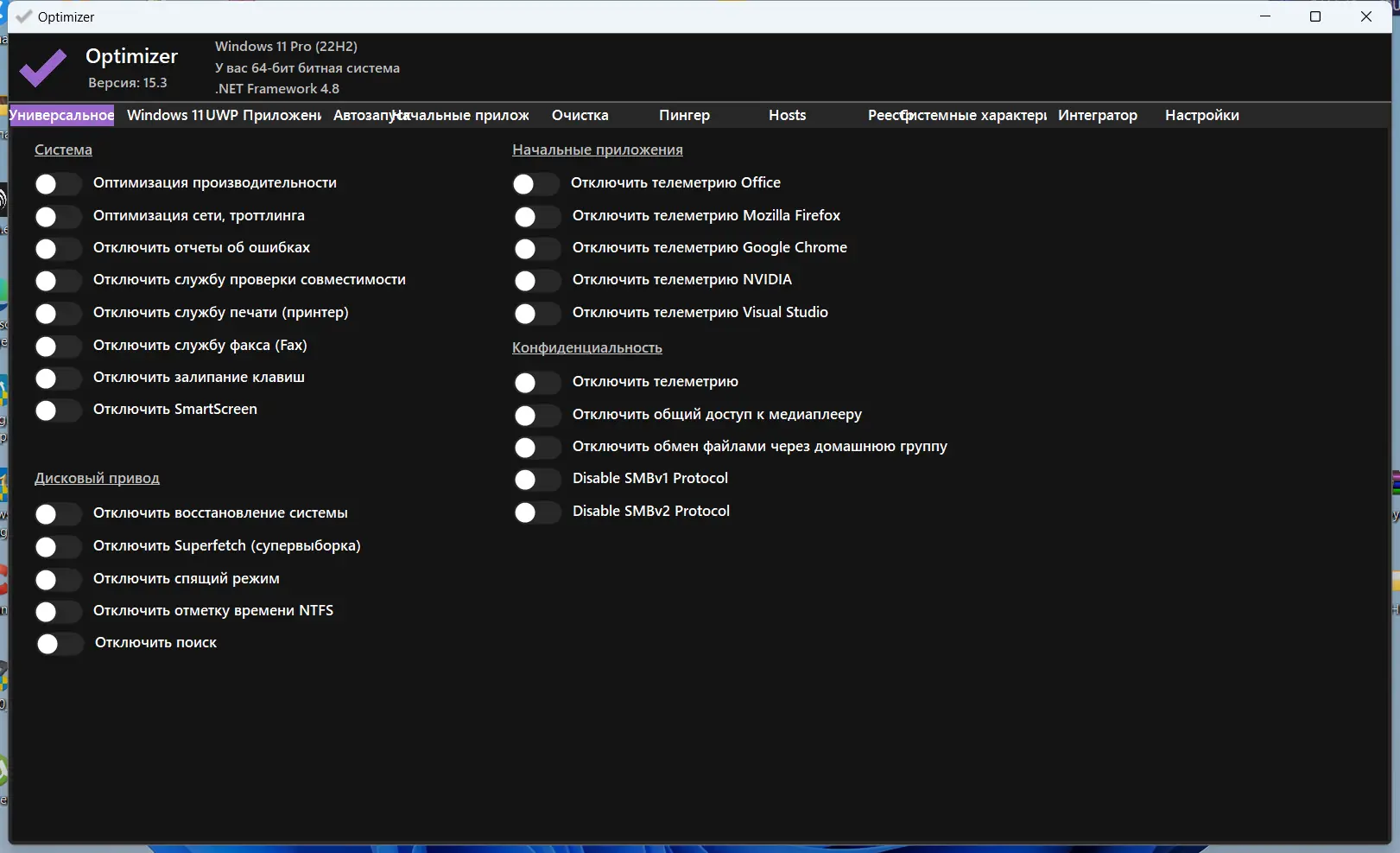 Optimizer — это мощная утилита для тонкой настройки операционной системы Windows, ориентированная на повышение уровня безопасности, приватности и общей производительности системы. Программа позволяет глубоко кастомизировать параметры ОС, отключая нежелательные службы, телеметрию и фоновые процессы, которые могут замедлять работу компьютера или собирать данные о пользователе. Особенно эффективна после чистой установки Windows, когда система еще не загружена лишними компонентами.