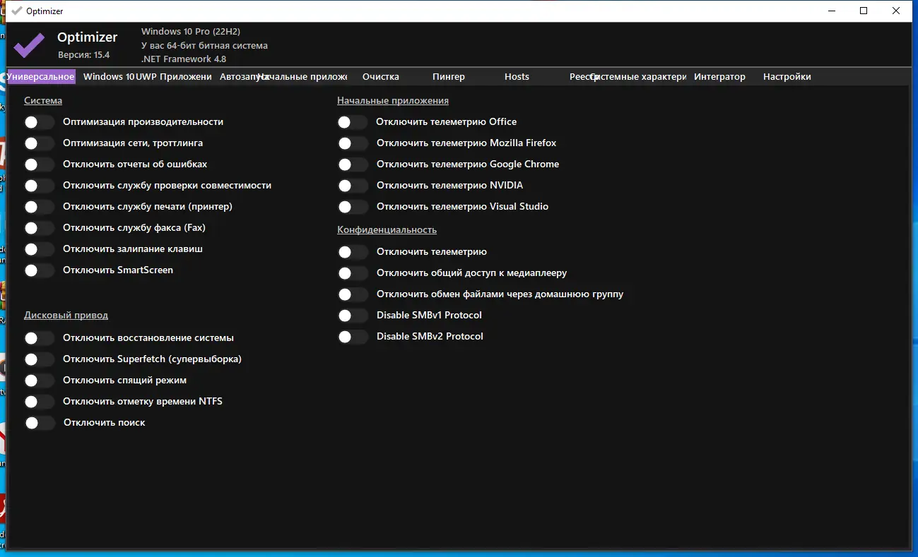 Optimizer предлагает широкий функционал для продвинутой настройки системы, что делает её ценным инструментом для тех, кто заботится о приватности и производительности. Программа учитывает особенности различных версий Windows, включая поддержку последних редакций, и позволяет тонко настраивать параметры, недоступные через стандартные средства ОС. Однако из-за обширного набора опций новичкам следует быть осторожными при выборе настроек, чтобы избежать непреднамеренных сбоев.