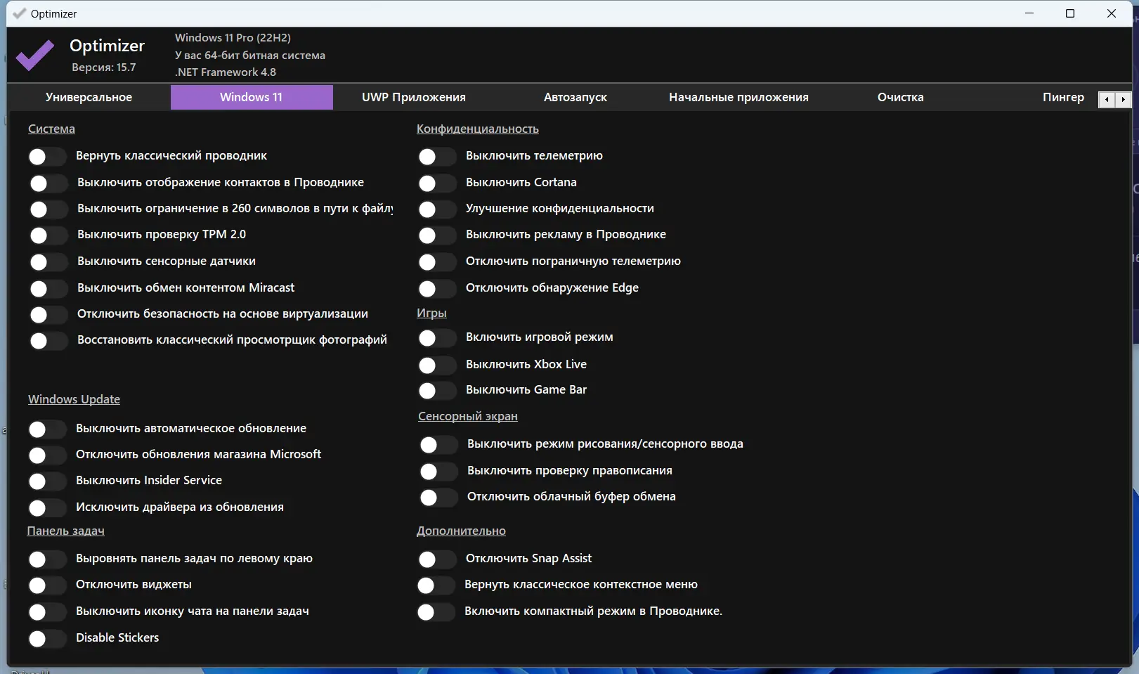 Optimizer — это мощная утилита для расширенной настройки операционной системы Windows, ориентированная на повышение уровня безопасности, приватности и общей производительности. Программа позволяет глубоко кастомизировать систему, отключая телеметрию, ненужные службы и встроенные приложения, а также оптимизируя сетевые и реестровые параметры. Особенно эффективно средство проявляет себя после чистой установки Windows, когда требуется быстро настроить систему под конкретные задачи. Поддержка множества языков, включая русский, делает инструмент доступным для широкого круга пользователей. Все изменения вносятся через интуитивно понятный интерфейс без необходимости ручного вмешательства в системные файлы.