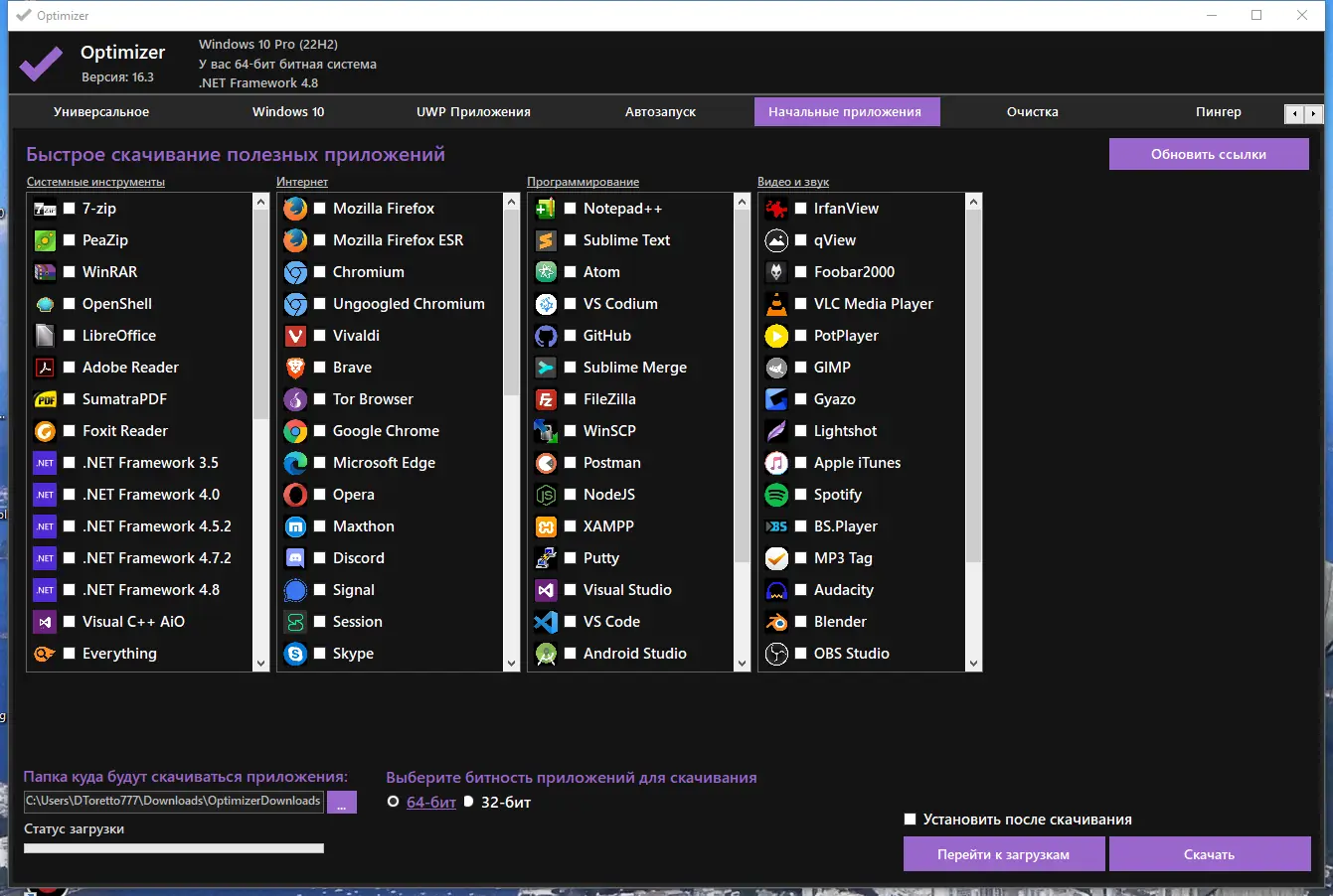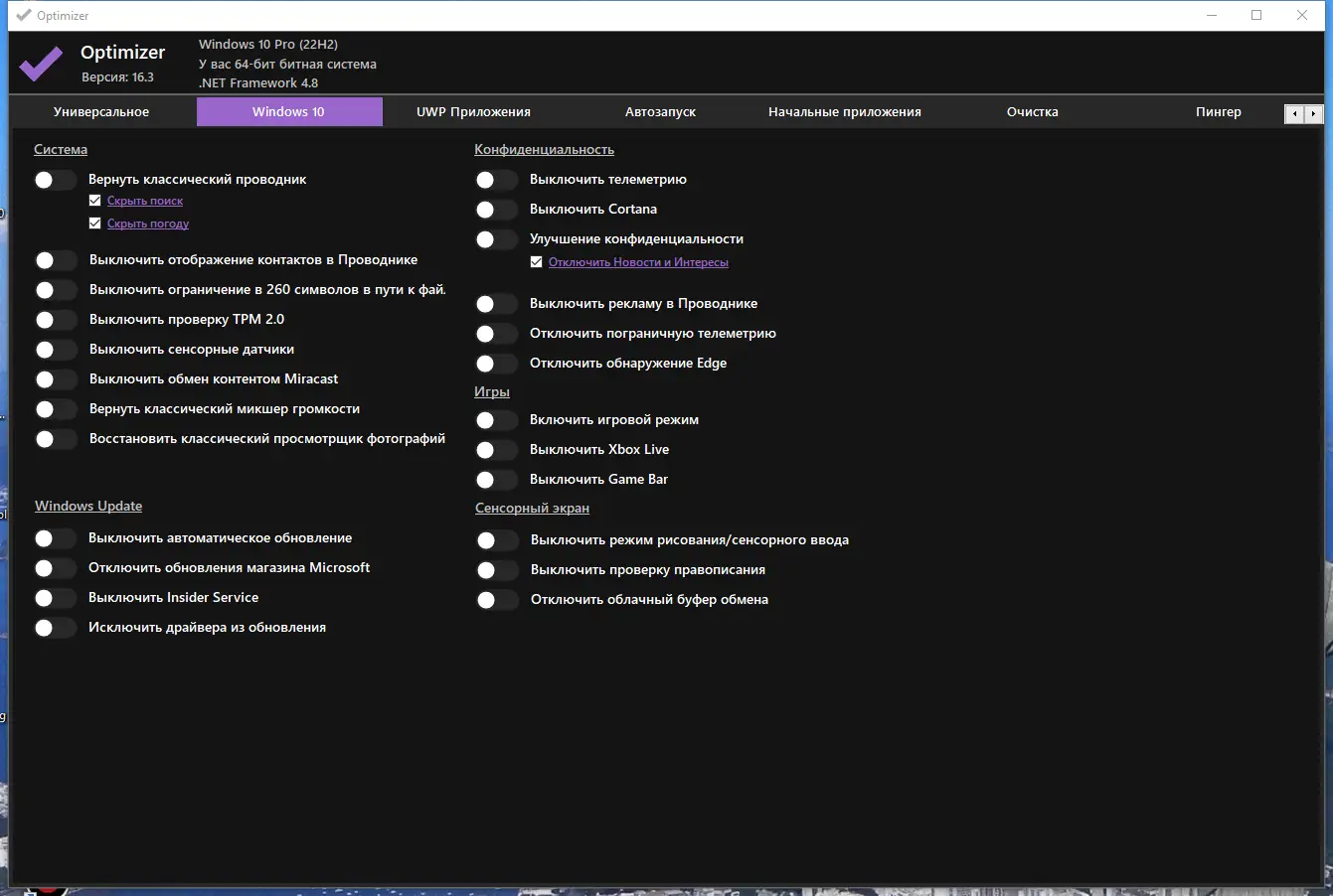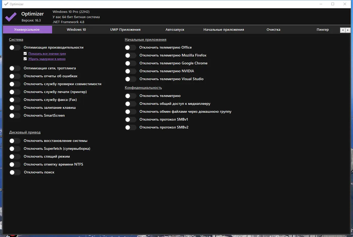 Optimizer — это мощная утилита для тонкой настройки операционной системы, позволяющая усилить конфиденциальность, повысить производительность и устранить нежелательные функции Windows. Программа идеально подходит после чистой установки системы, обеспечивая глубокую оптимизацию и контроль над параметрами безопасности и автозагрузки. С её помощью можно легко деактивировать телеметрию, управлять службами и подготовить компьютер к эффективной работе без лишних компонентов.