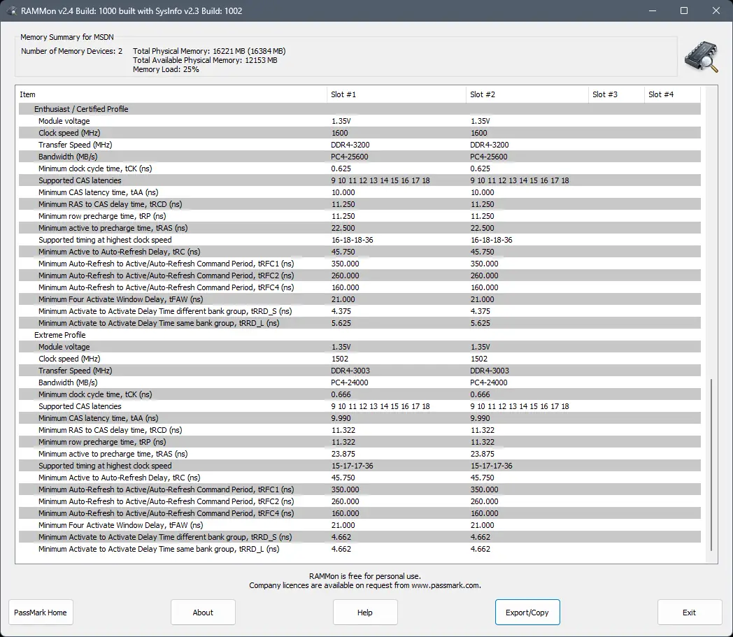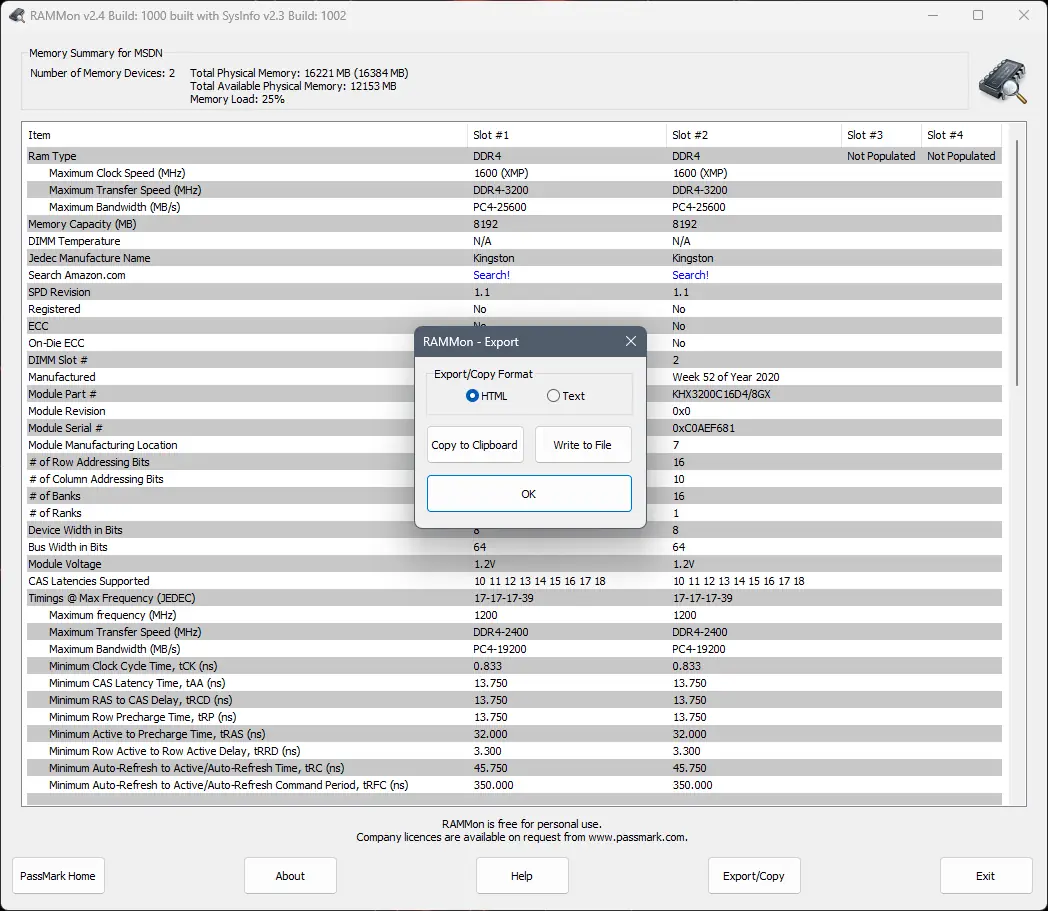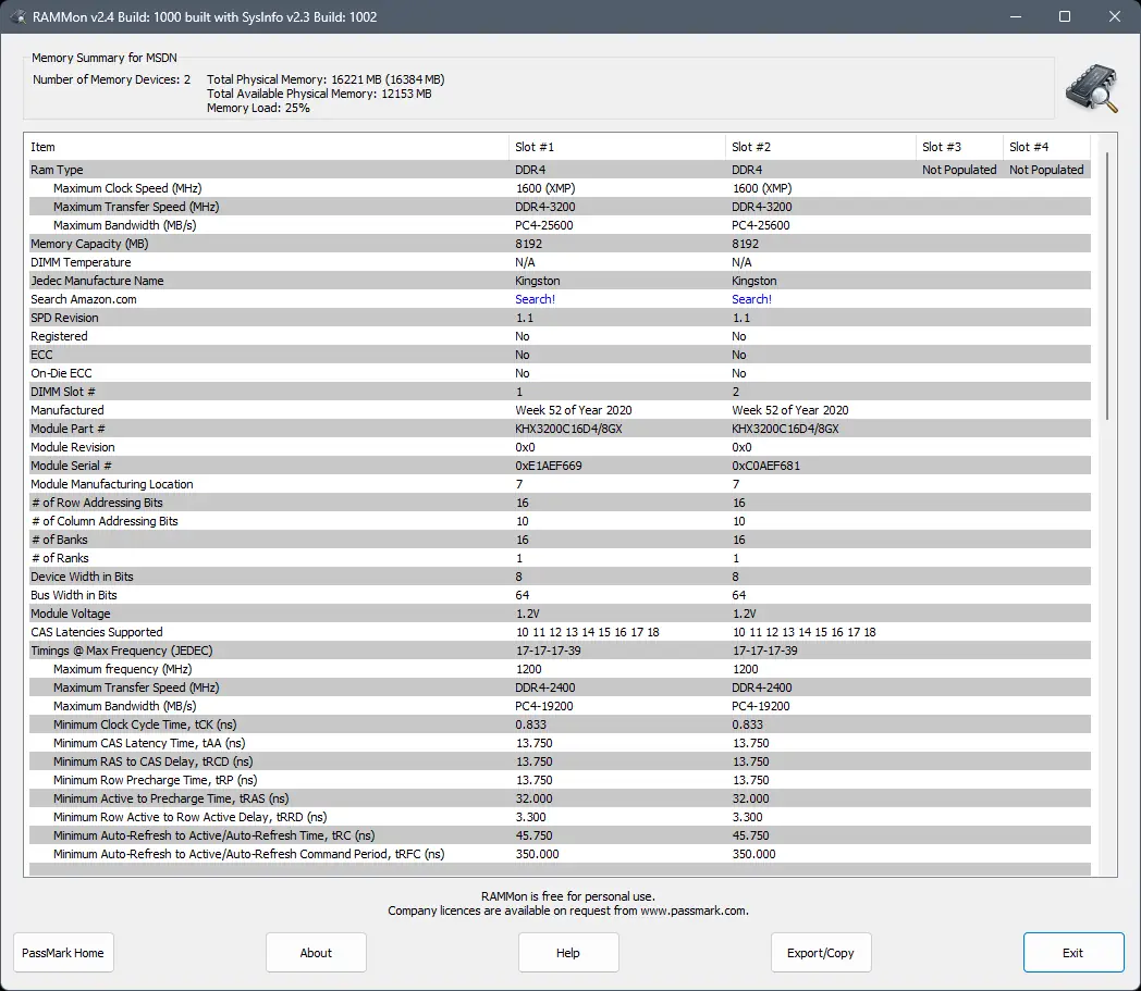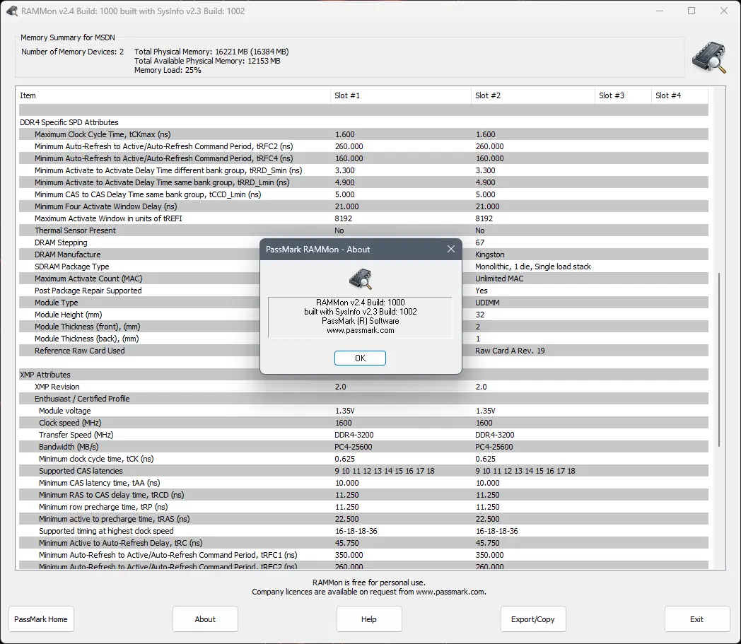 PassMark RAMMon — это компактная утилита для анализа и отображения данных SPD модулей оперативной памяти, позволяющая получить подробную информацию о характеристиках установленного ОЗУ, включая частоту, тайминги, производителя и температуру.