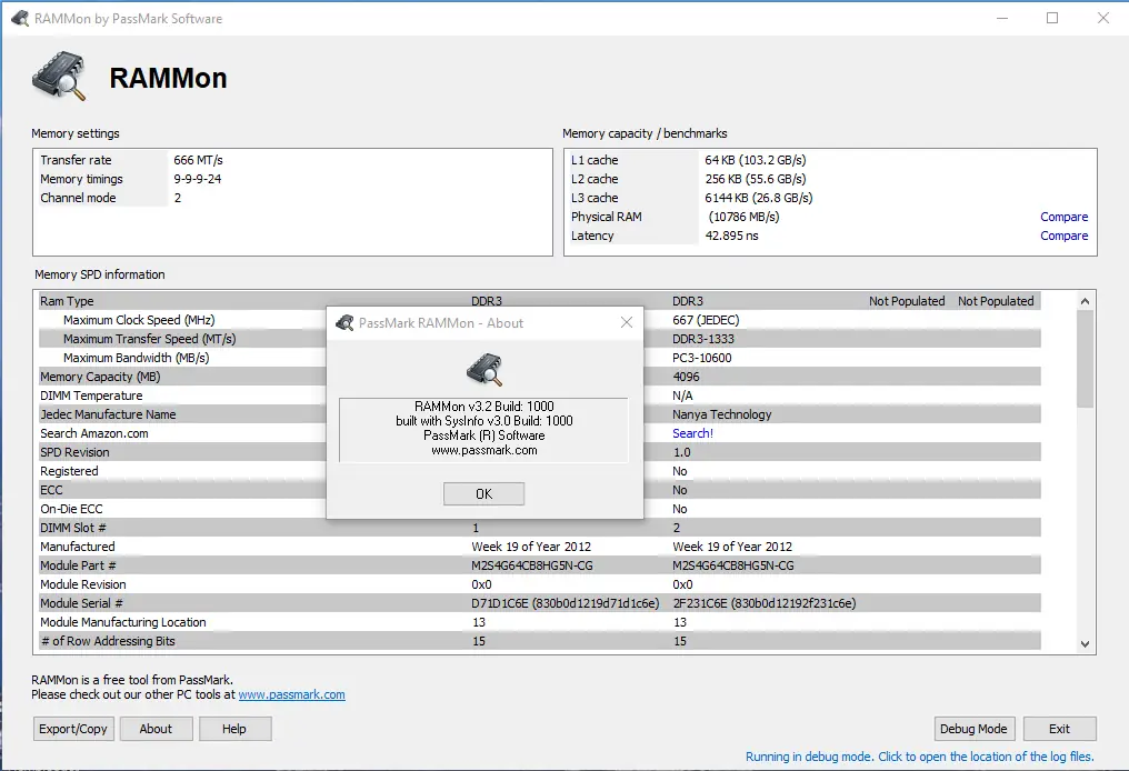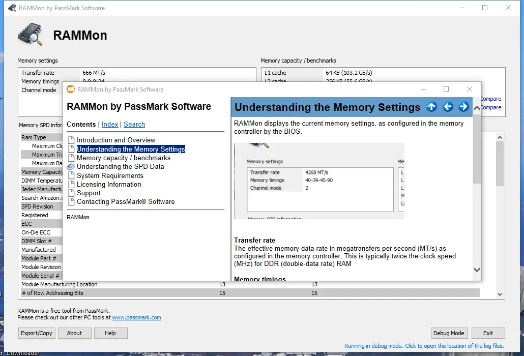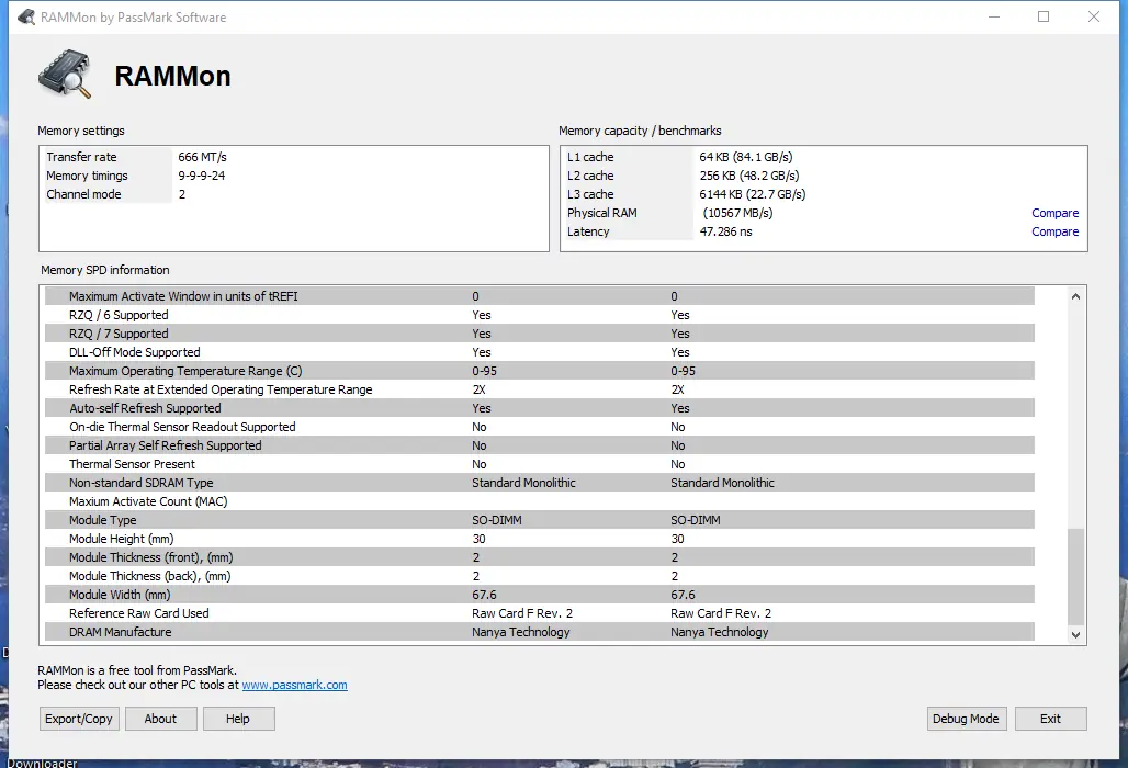 PassMark RAMMon — это инструмент для детального анализа параметров оперативной памяти, позволяющий получить точные данные о каждом модуле RAM, установленном в системе. Программа считывает информацию SPD и отображает её в удобной форме, включая технические характеристики, такие как частота, тайминги, напряжение и производитель.