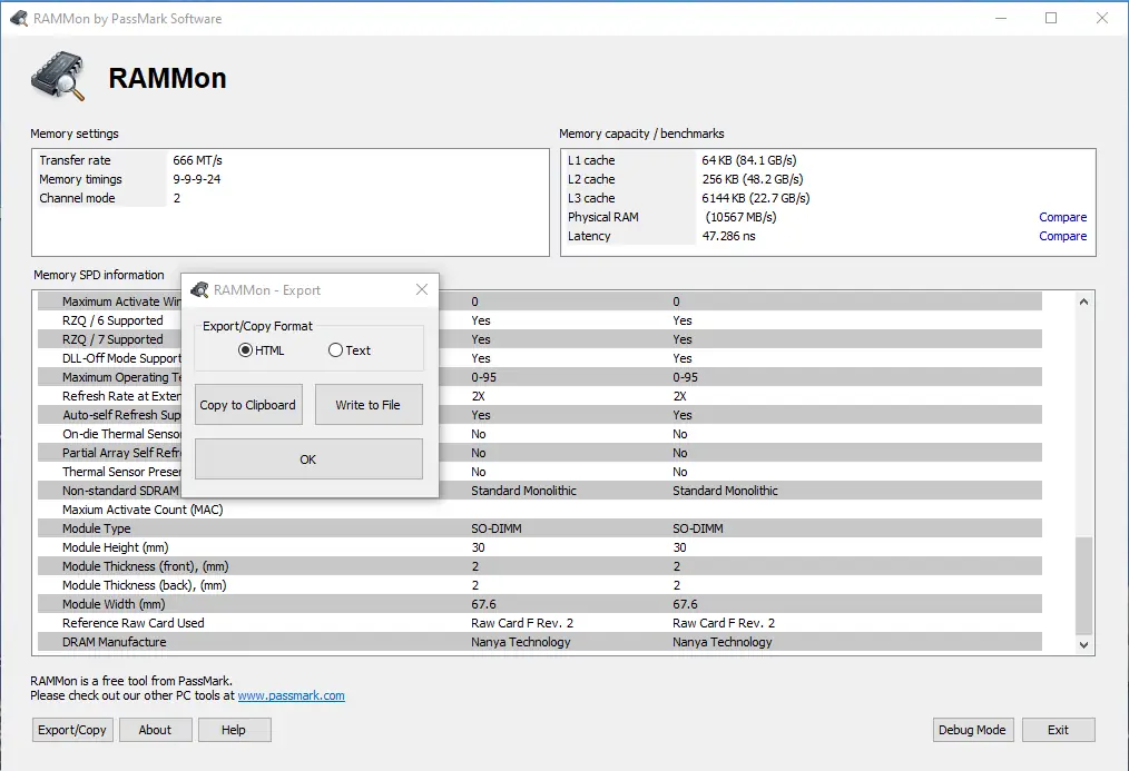 PassMark RAMMon сочетает в себе функциональность и простоту, что делает её ценным инструментом для диагностики компонентов системы. Программа быстро справляется с задачей сбора информации и предоставляет данные, которые не всегда доступны в стандартных системных утилитах. При этом она остаётся легковесной и не нагружает систему в процессе работы. Поддержка широкого спектра типов памяти и возможность экспорта результатов добавляют ей универсальности.