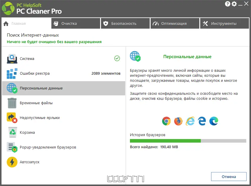 - Удаление нежелательных файлов и чистка личных данных, таких как кэш, временные файлы и история браузера