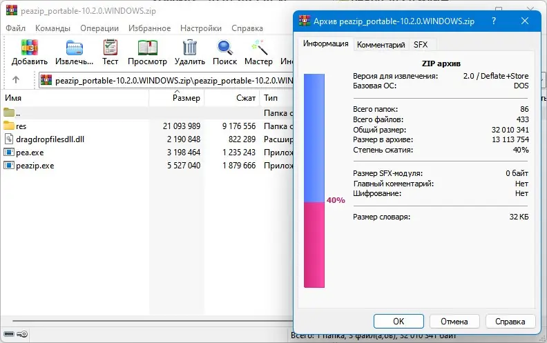 PeaZip — это бесплатный архиватор с открытым исходным кодом, сочетающий в себе функции графической оболочки и универсального инструмента для работы с архивами. Программа поддерживает множество форматов, включая собственный PEA, обеспечивает надёжное шифрование, работу с многотомными архивами и портативный режим. Подходит как для повседневного использования, так и для сложных задач архивации и защиты данных.
