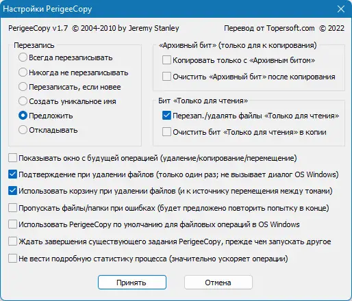 Преимущества PerigeeCopy проявляются в стабильности и гибкости при выполнении операций с файлами. Программа не просто копирует или удаляет, но делает это с учётом реальных потребностей пользователя: пропускает временно недоступные файлы, позволяет отложить решение о перезаписи, не блокирует весь процесс из-за мелких ошибок. Поддержка резервного копирования через бит архива и очистка атрибутов «только для чтения» расширяет сценарии использования. В то же время, программа остаётся компактной и не требует установки дополнительных компонентов. Её поведение можно тонко настроить под конкретные задачи, будь то системное администрирование или повседневная работа с документами.