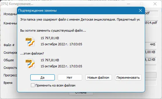 - Гибкие настройки перезаписи файлов: «спросить», «отложить», «автоматически»