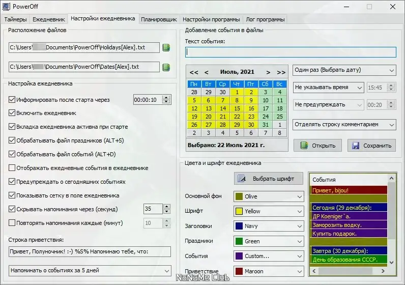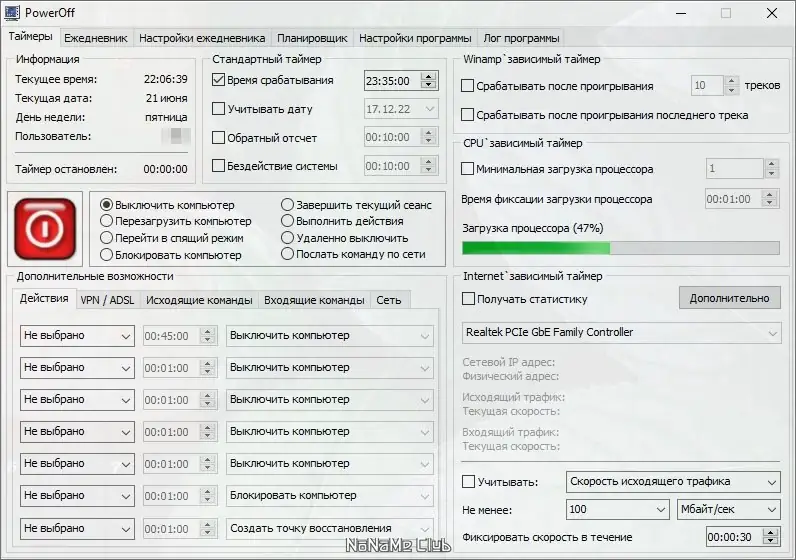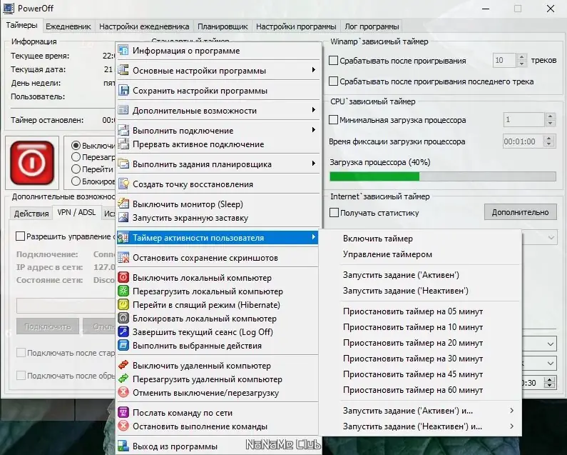 - Гибкие настройки таймера, включая зависимость от активности интернета, Winamp и загрузки процессора