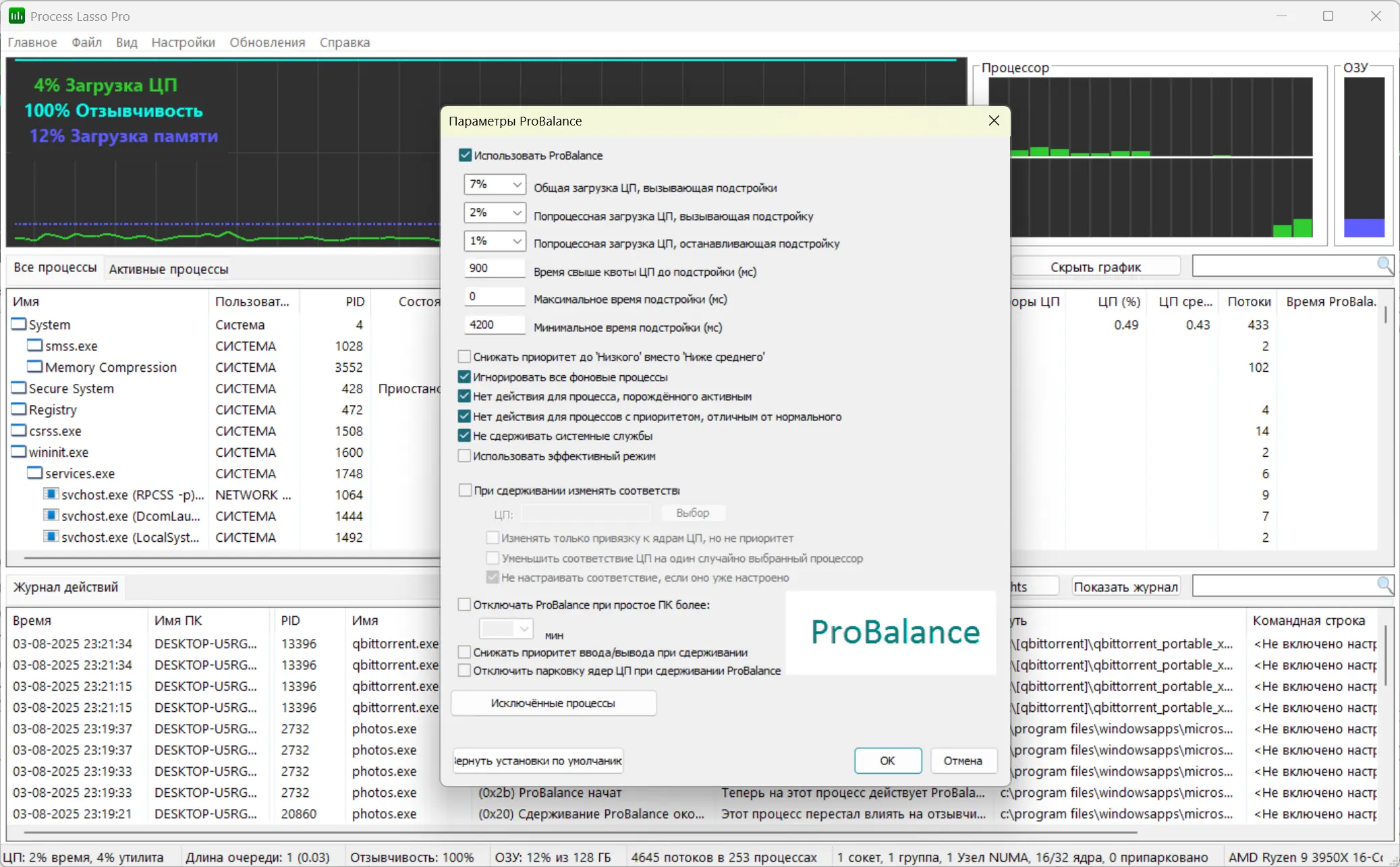 - Технология ProBalance автоматически снижает приоритет процессов, вызывающих чрезмерную нагрузку на CPU, освобождая ресурсы для других задач.