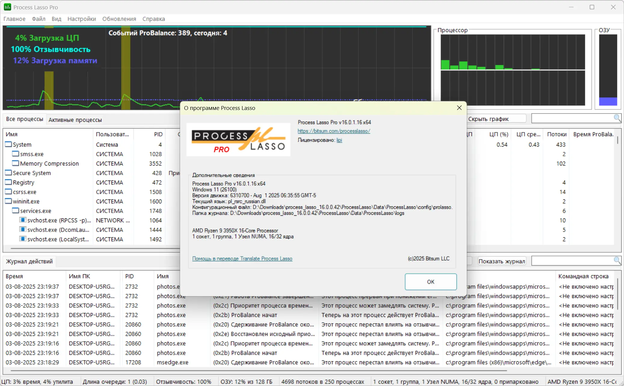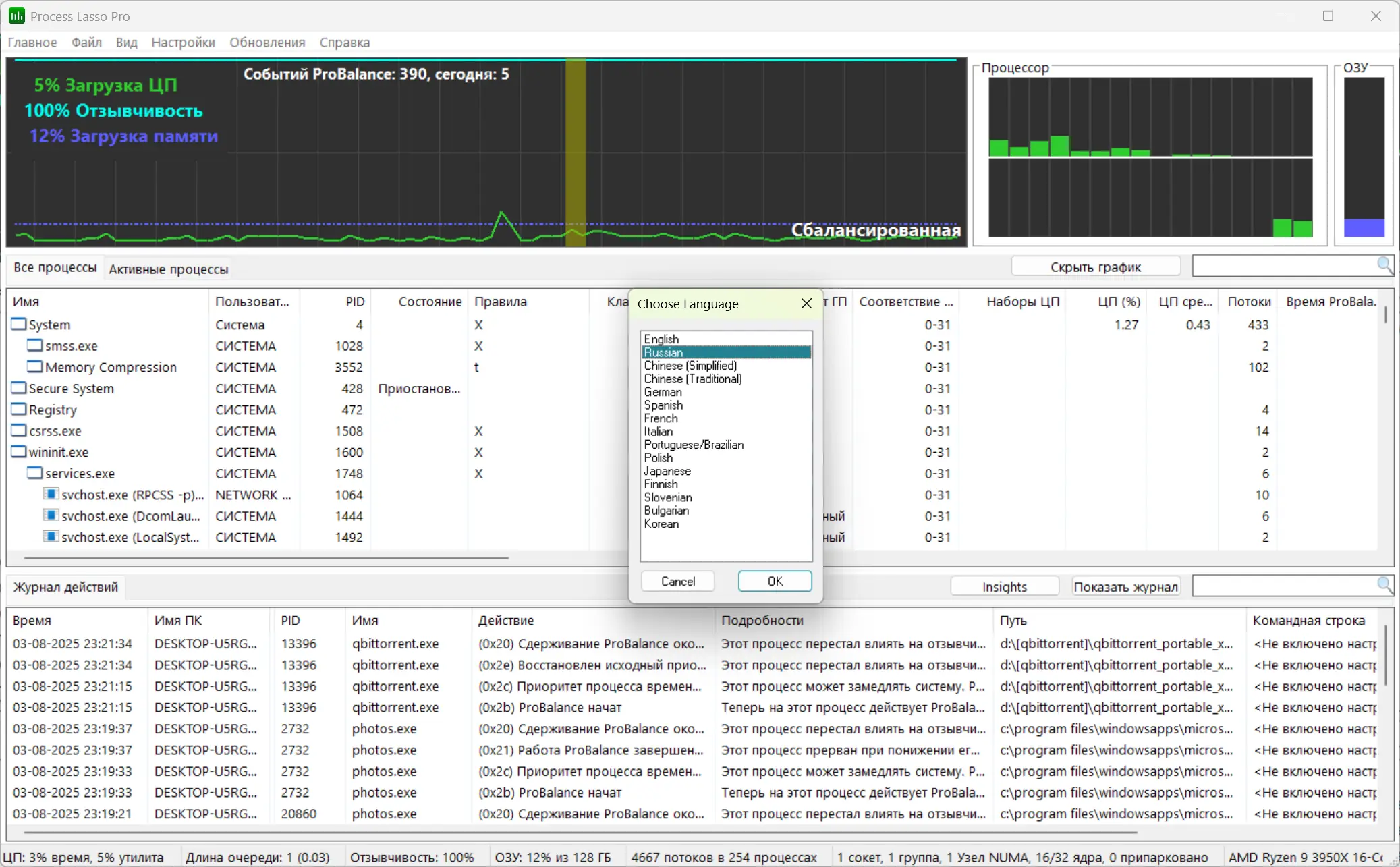 Process Lasso — мощная системная утилита для управления приоритетами процессов в реальном времени, обеспечивающая высокую отзывчивость операционной системы даже при сильной нагрузке на процессор. Программа автоматически регулирует поведение приложений, предотвращая зависания и торможение. Благодаря технологии ProBalance она эффективно распределяет ресурсы, не требуя вмешательства пользователя.