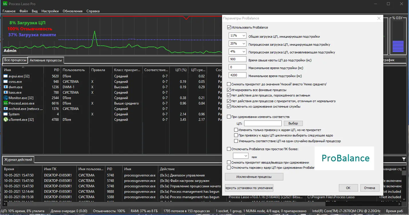 Технология ProBalance динамически корректирует приоритеты, предотвращая «зависание» системы при пиковых нагрузках.