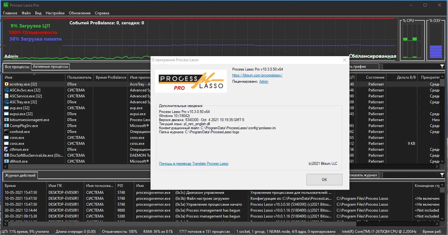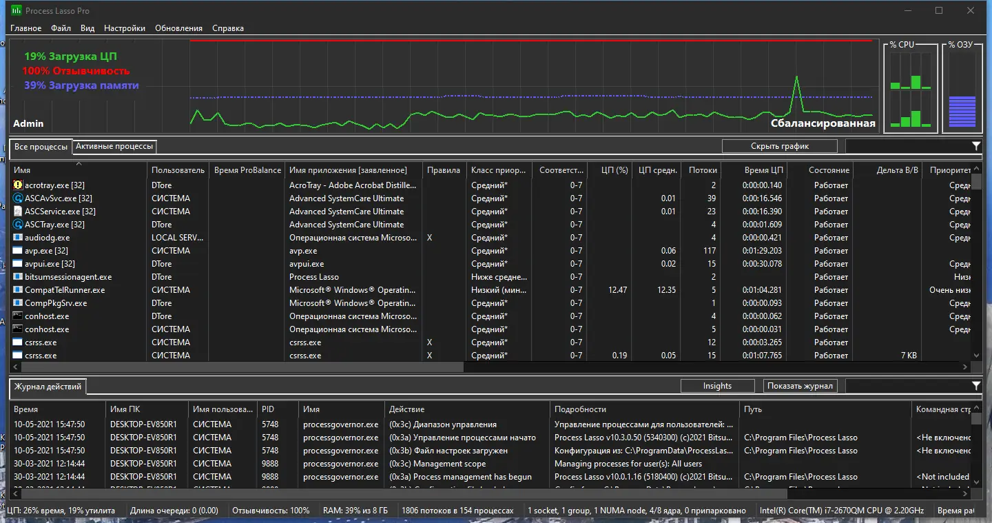 Process Lasso — это утилита для тонкой настройки процессов операционной системы, направленная на повышение отзывчивости и стабильности компьютера. Программа автоматически регулирует приоритеты запущенных приложений, предотвращая перегрузку процессора и зависания системы.
