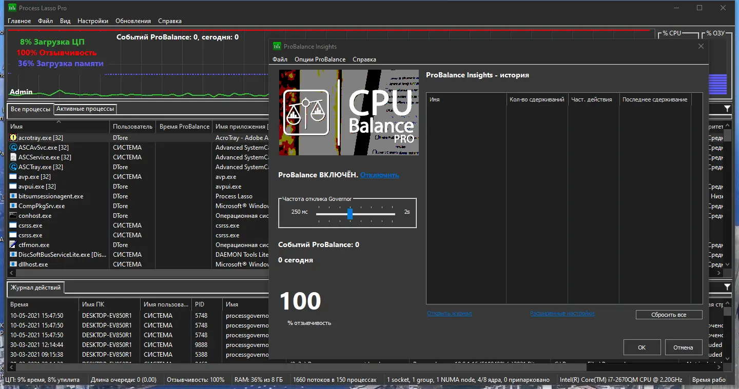 Пользоваться Process Lasso просто благодаря интуитивно понятному интерфейсу. После запуска программа отображает список всех активных процессов, где можно вручную изменить приоритет, установить правила автоматического управления или задать привязку к ядрам ЦП. Правой кнопкой мыши вызывается контекстное меню с быстрыми командами, что ускоряет настройку. График реактивности системы в реальном времени помогает оценить эффективность внесённых изменений. Даже при закрытом окне приложение продолжает работать в фоне, контролируя процессы согласно заданным правилам.