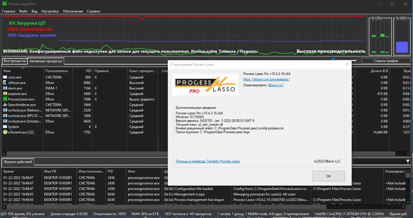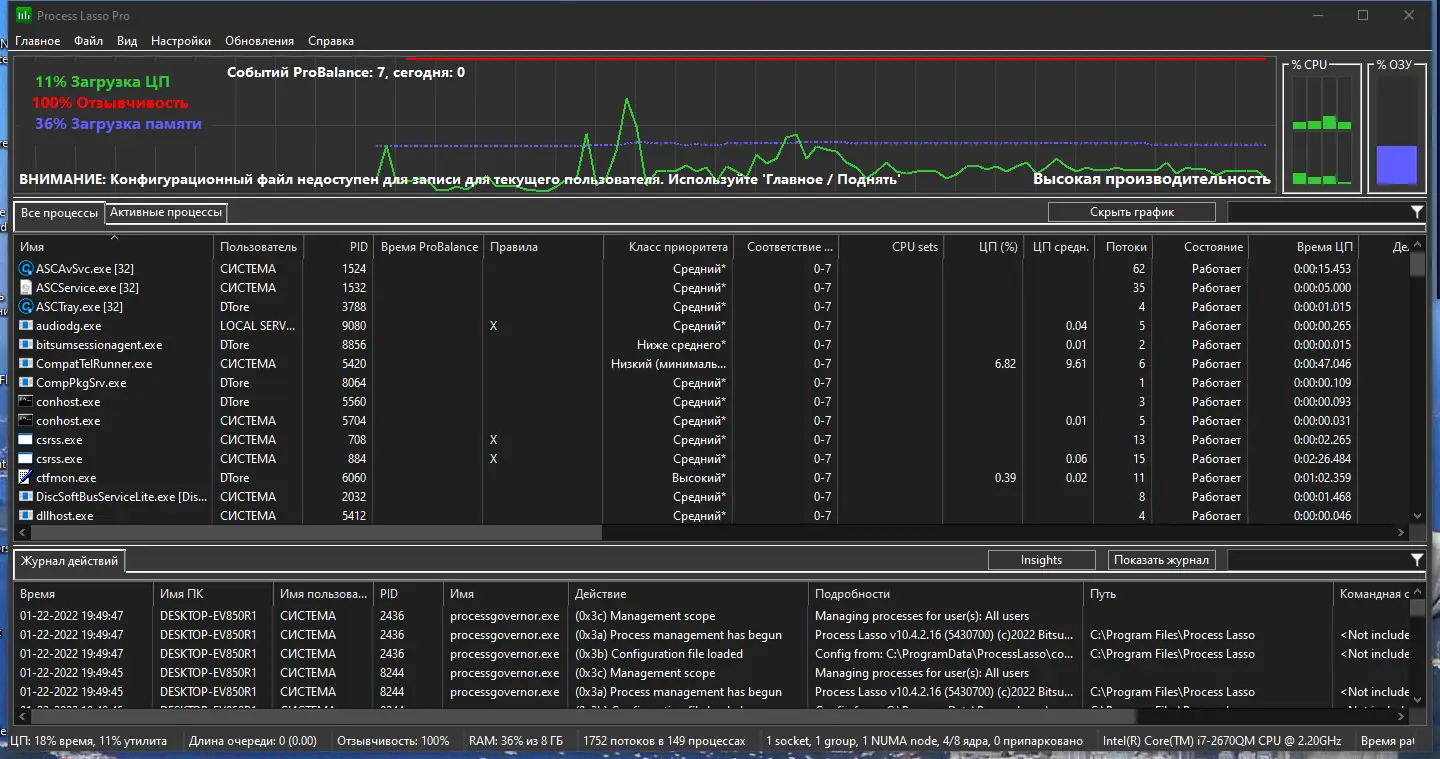 Process Lasso — это системная утилита, предназначенная для оптимизации производительности компьютера за счёт управления приоритетами запущенных процессов. Программа автоматически регулирует нагрузку на процессор, предотвращая зависания и повышая отзывчивость системы при высокой нагрузке.