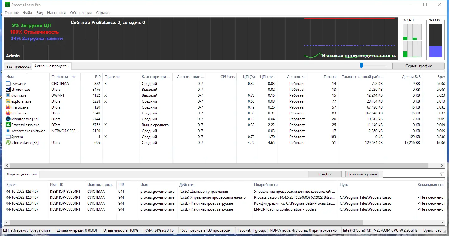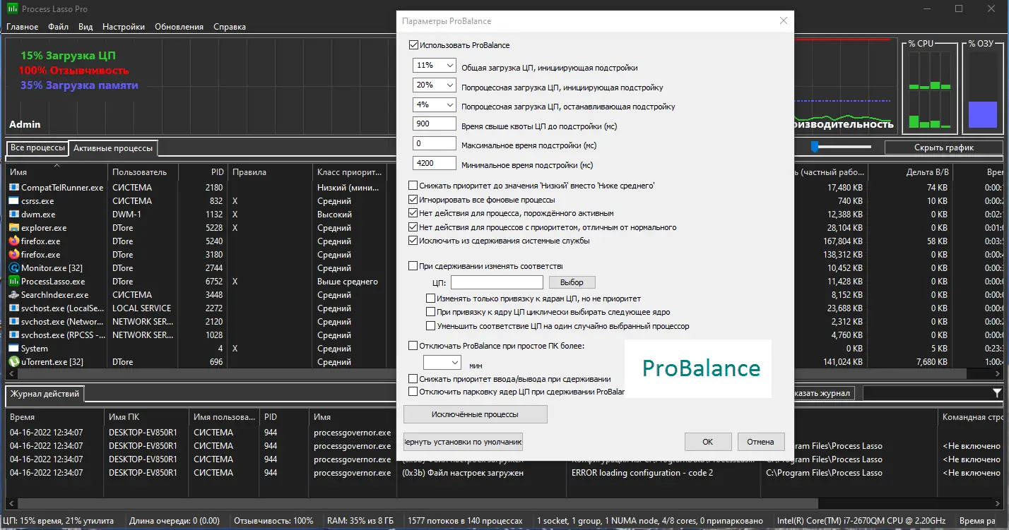Технология ProBalance обеспечивает стабильный отклик системы, даже если отдельные процессы используют 100% процессорного времени.