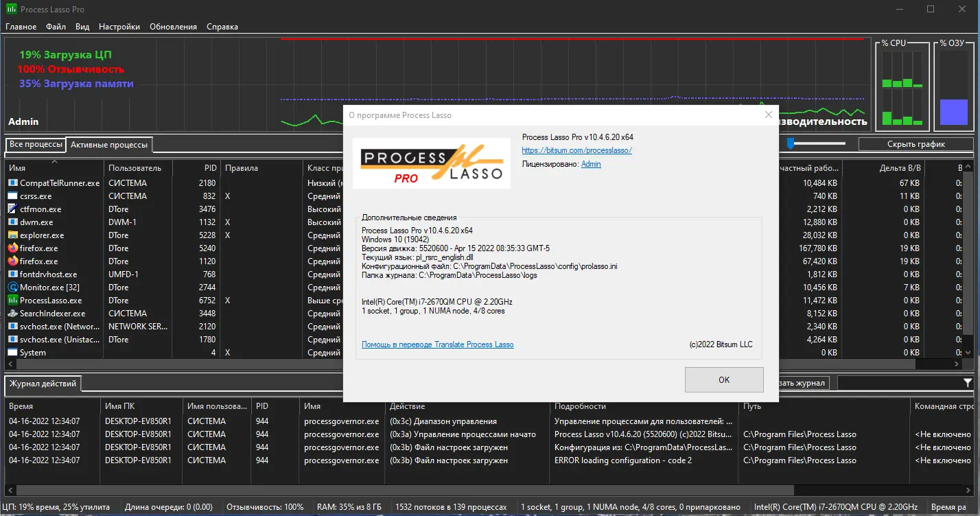 Process Lasso — это системная утилита, предназначенная для оптимизации производительности компьютера за счёт управления приоритетами запущенных процессов. Программа автоматически регулирует нагрузку на центральный процессор, предотвращая зависания и обеспечивая стабильную работу системы даже при высокой загрузке.