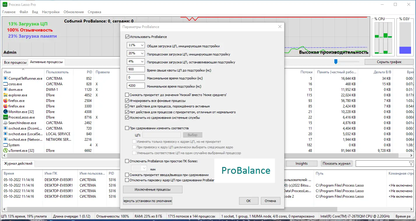 Технология ProBalance автоматически определяет процессы, вызывающие высокую нагрузку, и корректирует их приоритеты, не прерывая выполнение задач.