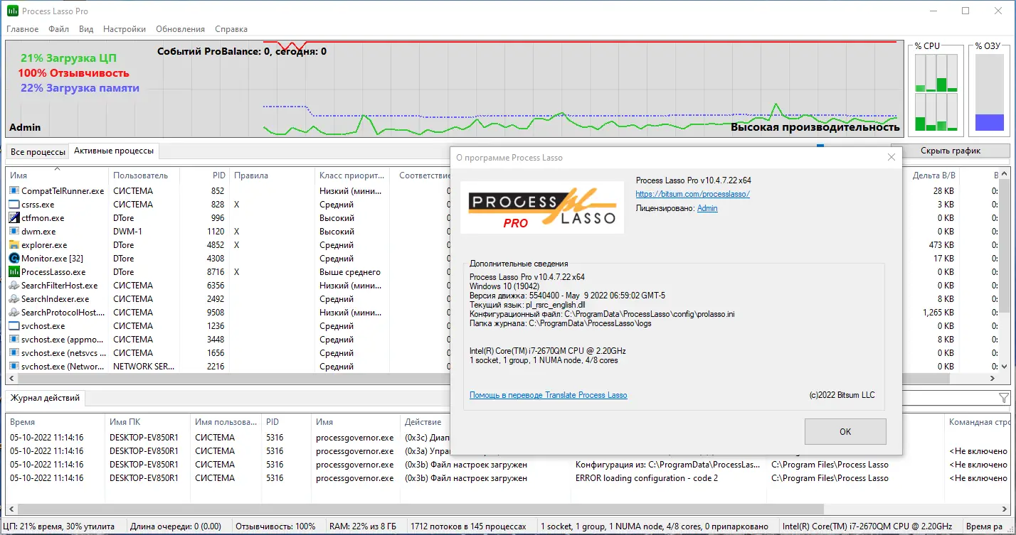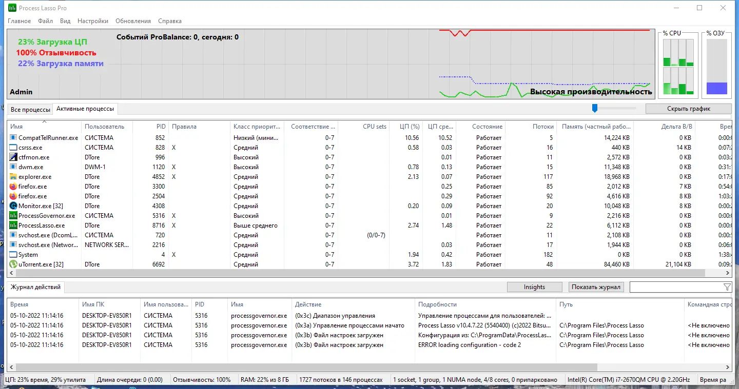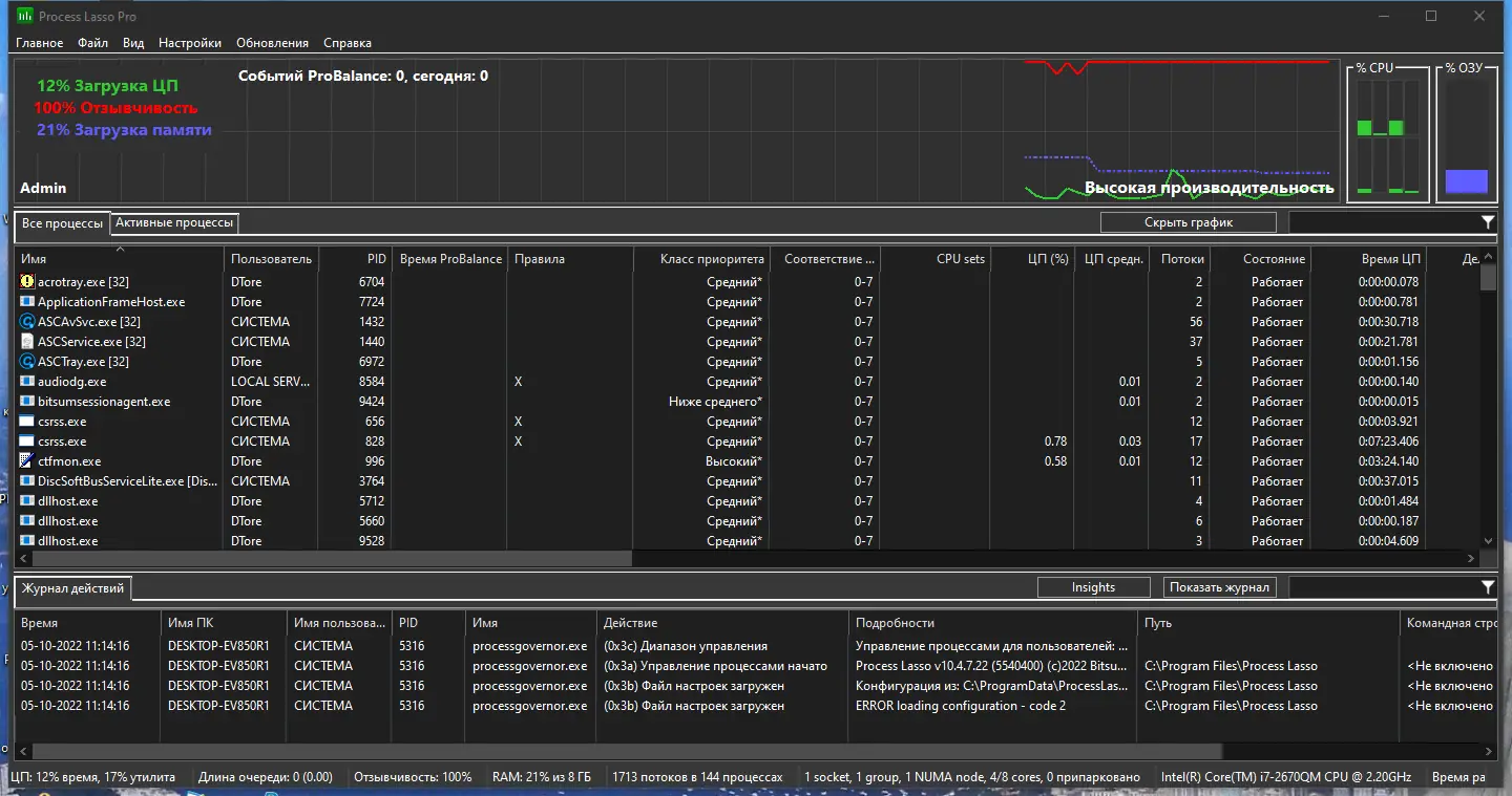 Использование программы не требует глубоких технических знаний. Интерфейс интуитивно понятен и позволяет быстро настроить правила поведения для различных приложений. Через контекстное меню можно мгновенно изменить приоритет процесса, назначить его на определённое ядро процессора или установить ограничения. Все изменения применяются в реальном времени, а всплывающие уведомления информируют о внесённых корректировках. Даже при закрытом окне программа продолжает контролировать систему, выполняя задачи в фоне. График реактивности системы наглядно демонстрирует эффективность настройки и помогает выявить узкие места в производительности.