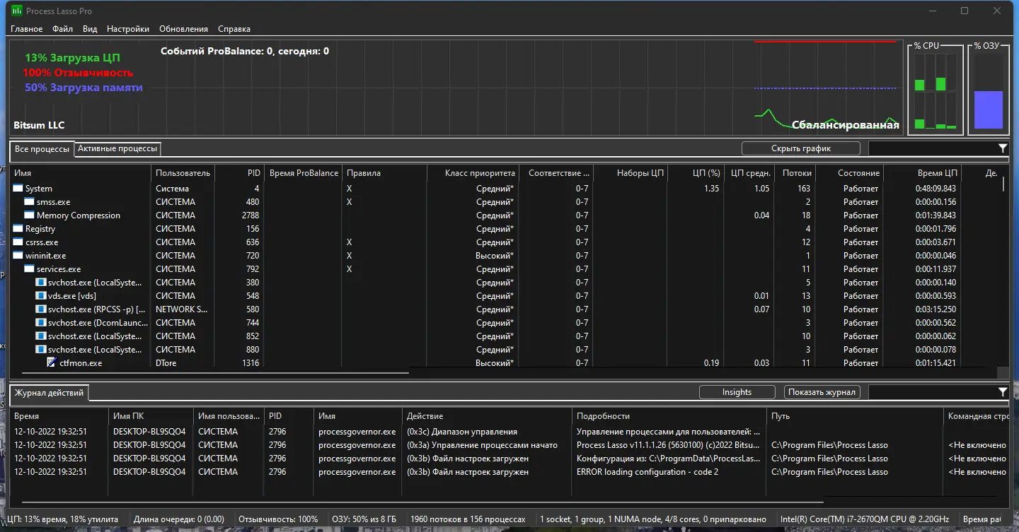 Process Lasso демонстрирует высокую эффективность в повседневной эксплуатации, особенно на системах со средним или слабым уровнем производительности. Программа не перегружает систему собственными процессами и работает в фоне с минимальным потреблением ресурсов. При этом она способна значительно улучшить общее ощущение от работы с компьютером, устраняя лаги и зависания. Поддержка 32-битных и 64-битных систем делает её универсальной для большинства современных конфигураций. Однако, как и любое ПО, утилита имеет свои ограничения, особенно в бесплатной версии.