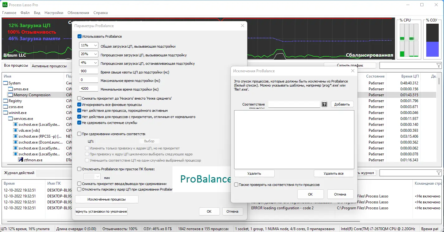 Технология ProBalance обеспечивает баланс между фоновыми и активными процессами, предотвращая блокировку интерфейса при высокой нагрузке.