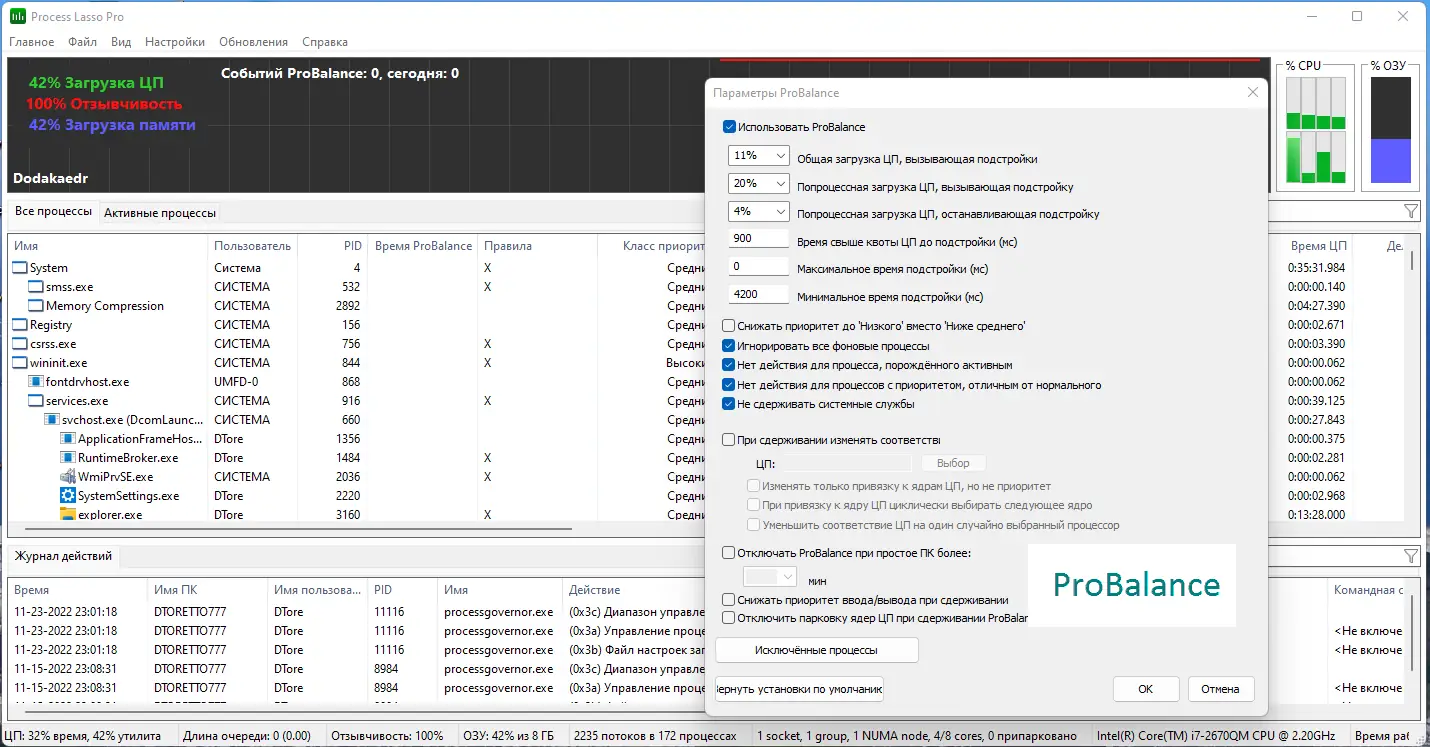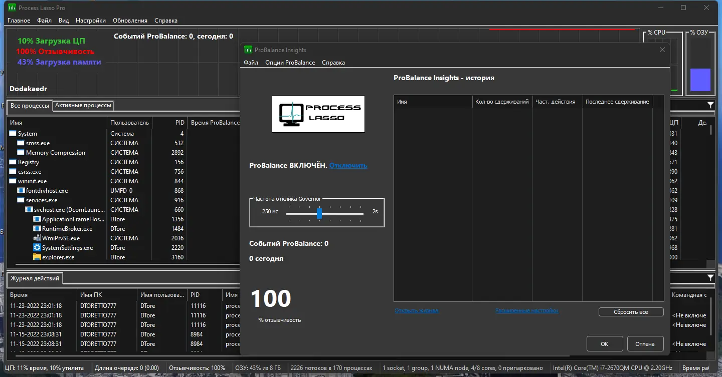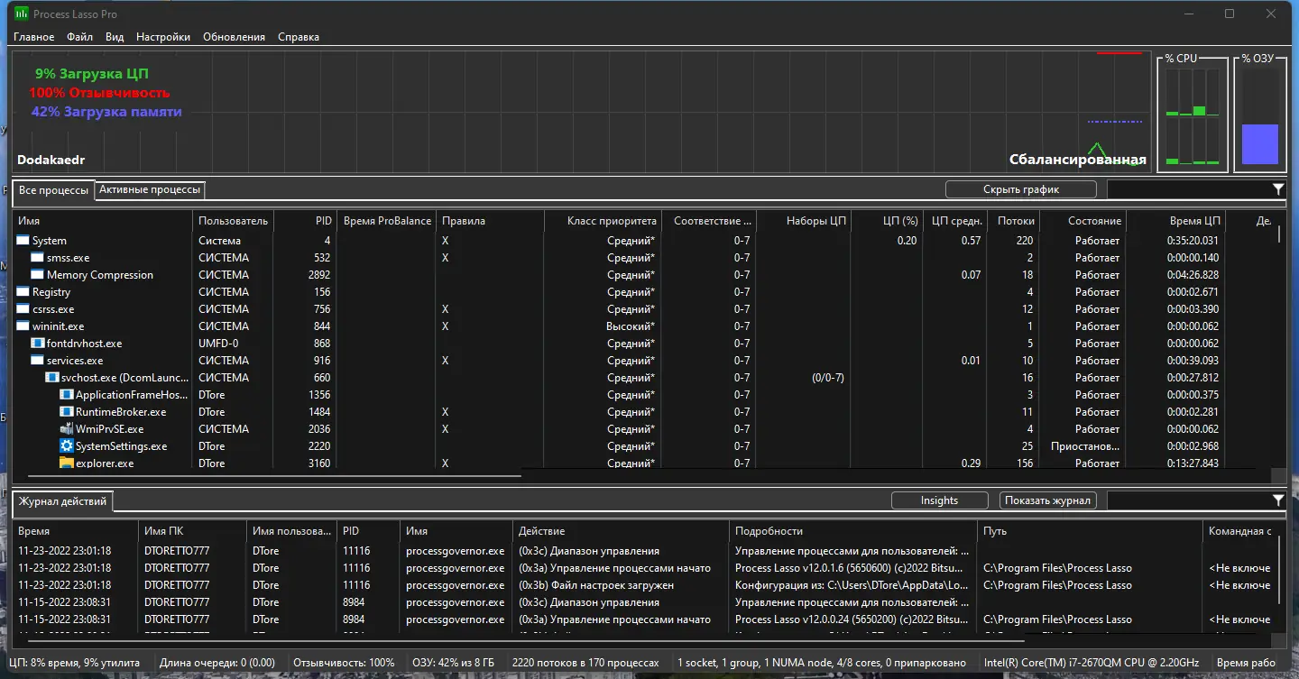 Process Lasso не просто отображает процессы — она активно управляет ими для достижения оптимальной производительности.