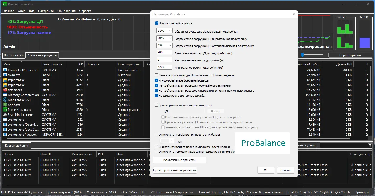 - Технология ProBalance эффективно предотвращает блокировку интерфейса при высокой нагрузке на процессор.