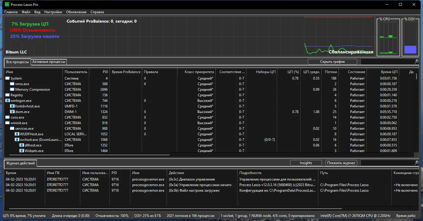 Process Lasso — это системная утилита, предназначенная для оптимизации производительности операционной системы за счёт управления приоритетами запущенных процессов. Программа автоматически регулирует нагрузку на центральный процессор, предотвращая зависания и снижая влияние ресурсоёмких приложений на общую отзывчивость системы.