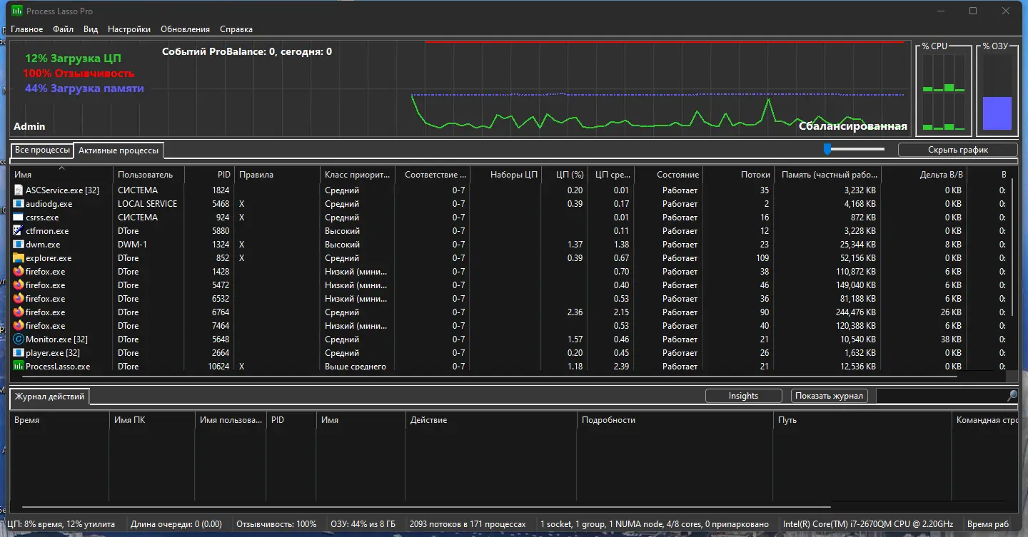 Process Lasso сочетает в себе мощные функции системного контроля и простоту использования. Утилита эффективно справляется с задачей повышения отзывчивости системы, особенно в условиях многозадачности. Благодаря встроенной статистике, пользователь может анализировать поведение процессов за определённый период и вносить корректировки в настройки.