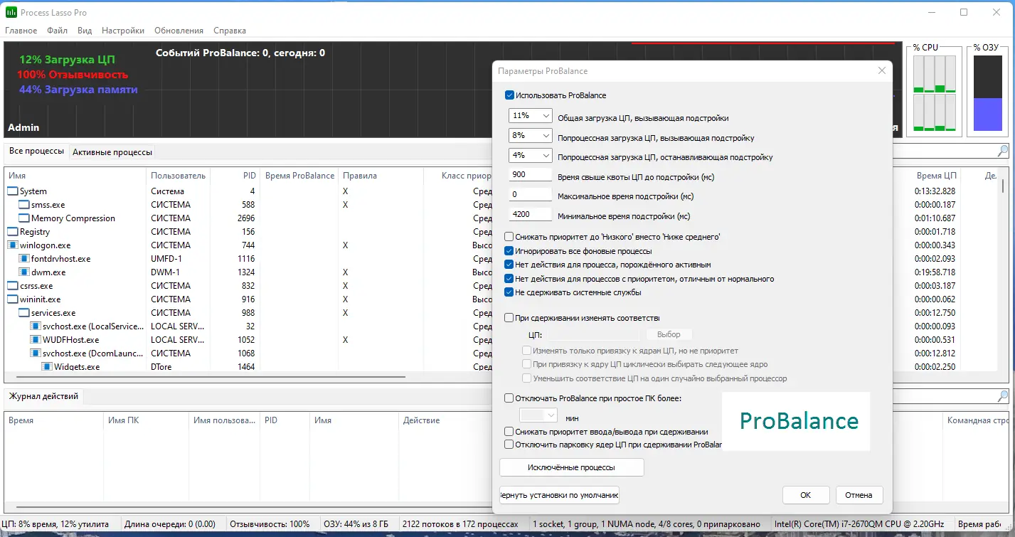 - Программа включает в себя технологию ProBalance, которая автоматически снижает приоритет процессов, чрезмерно нагружающих ЦП.